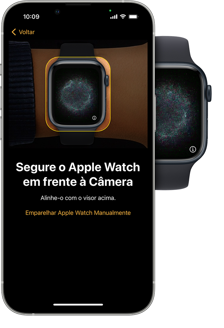 Segure o iPhone perto da animação exibida no Watch. Centralize o mostrador do Watch no visor do iPhone, depois aguarde a mensagem dizendo que o Apple Watch foi emparelhado. Se não puder usar a câmera, toque em "Emparelhar Apple Watch Manualmente" e siga as etapas exibidas.