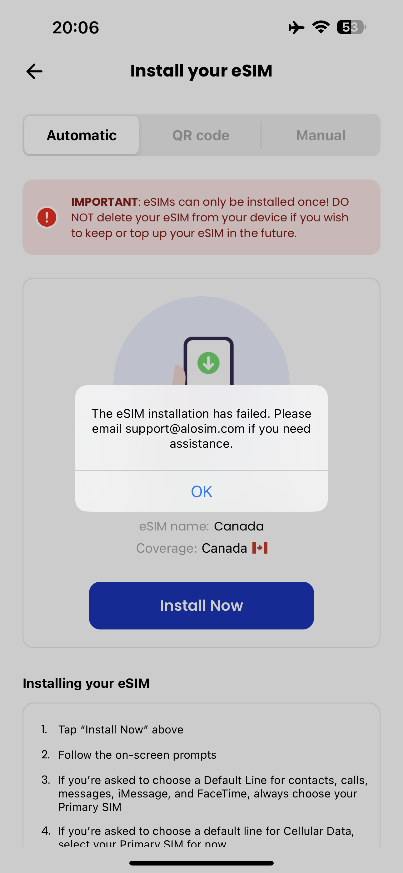 Fui viajar para o Canadá e comprei 3 ESIM, sendo que eles via app da ALO e outro da AIRALO e um da FIDO.