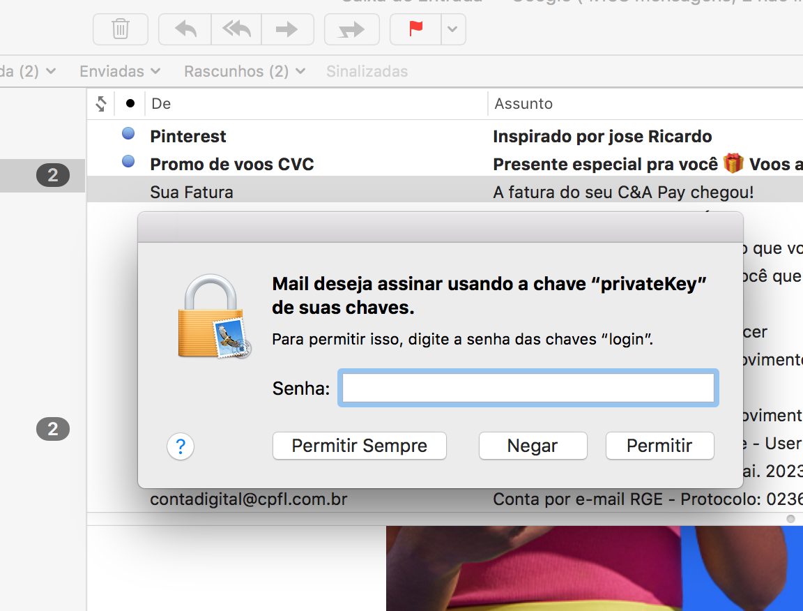 Do nada o mail está pedindo uma senha do privateKey. Todas que coloco não funciona. Cheguei a trocar a senha do ID do iCloud e o mail continua com problemas quando uso o gmail