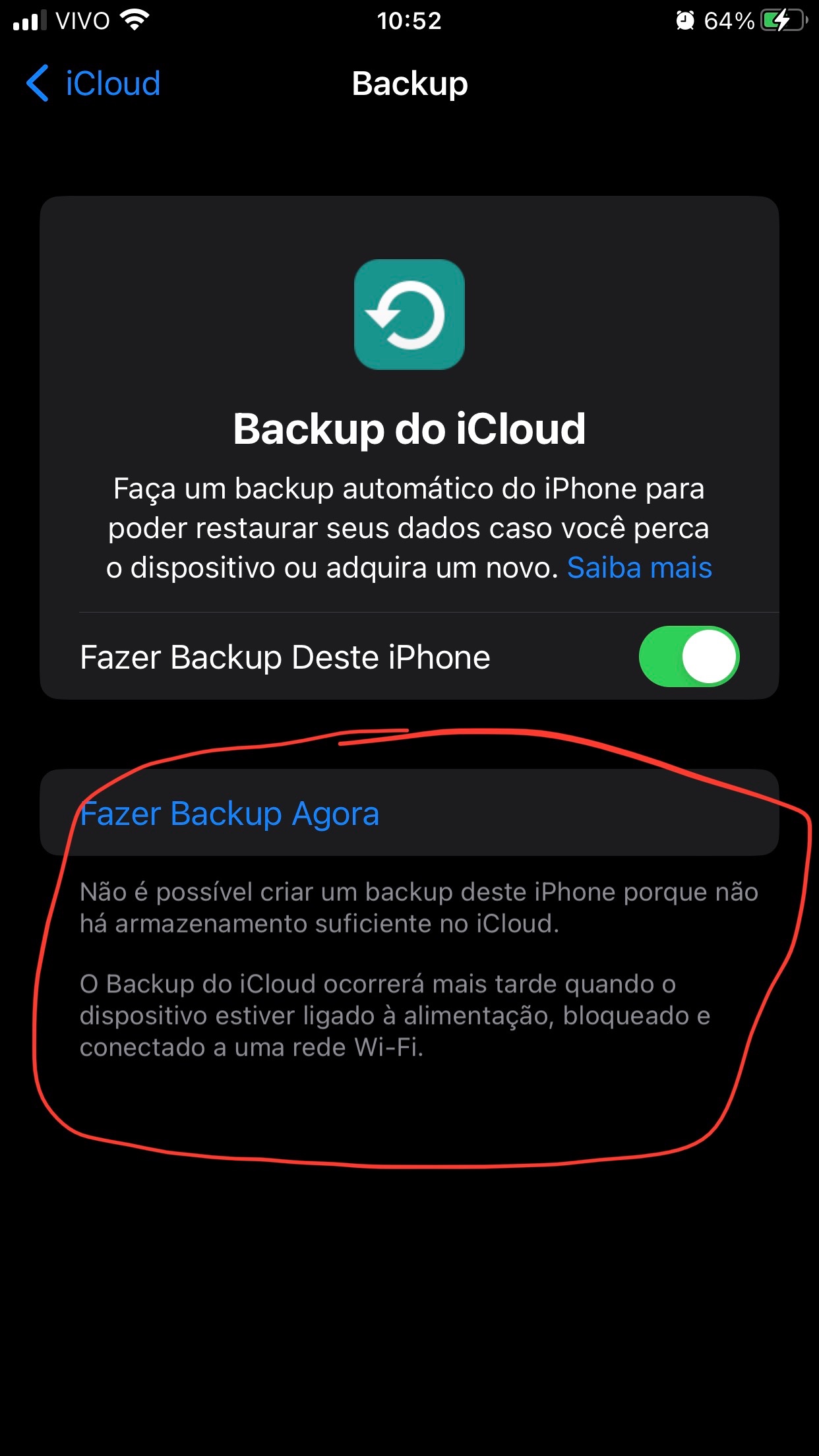 Como pode ver, não consigo fazer o backup dos meus dados mesmo tendo espaço, o que eu faço??