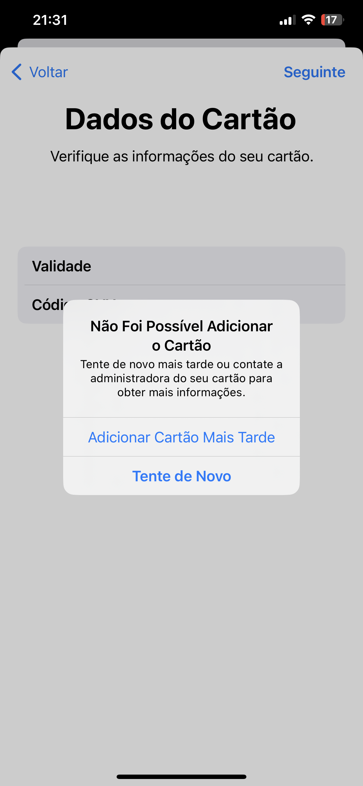 porém, eu consigo adicionar o mesmo cartão em outros iPhones, no 8 Plus, no 7 e no 14 Pro max, só no meu que não consigo cadastrar nenhum cartão!