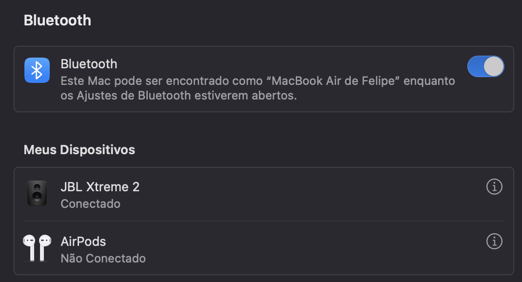 Tenho uma xtreme2 da JBL e consigo conectar ela no bluetooth do macbook air, porém, o dispositivo nao aparece nas opçoes de saída de audio do note.