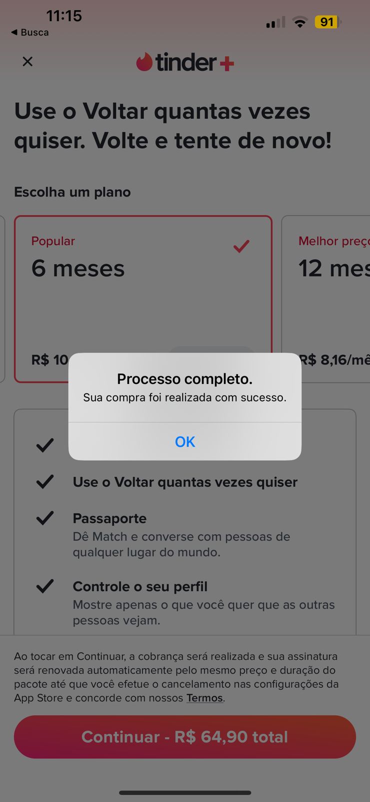 No dia 10/06 eu comprei o pacote Gold do Tinder, e o valor de 64,90 foi descontado,mesmo aparecendo Erro de Compra, domínio TNDRPurchaseRequestErroDomain Codigo:15. Solicitei o reembolso com vocês nao porque nao queria pagar, mas sim porque eu nao recebi o serviço pelo qual paguei ( Assim como mostrado nas fotos ). Não tenho problema nenhum em pagar pelo que COMPREI E FUNCIONA ( O que é o mínimo ) E não é nem pelos 64,90 e sim pelo fato de que foi um pacote de 6 meses ,meses esse que não vou receber. Não me importo em perde um tempo da minha vida para denunciar esta má conduta de vocês, visando que eu tenho como provar que não recebi.