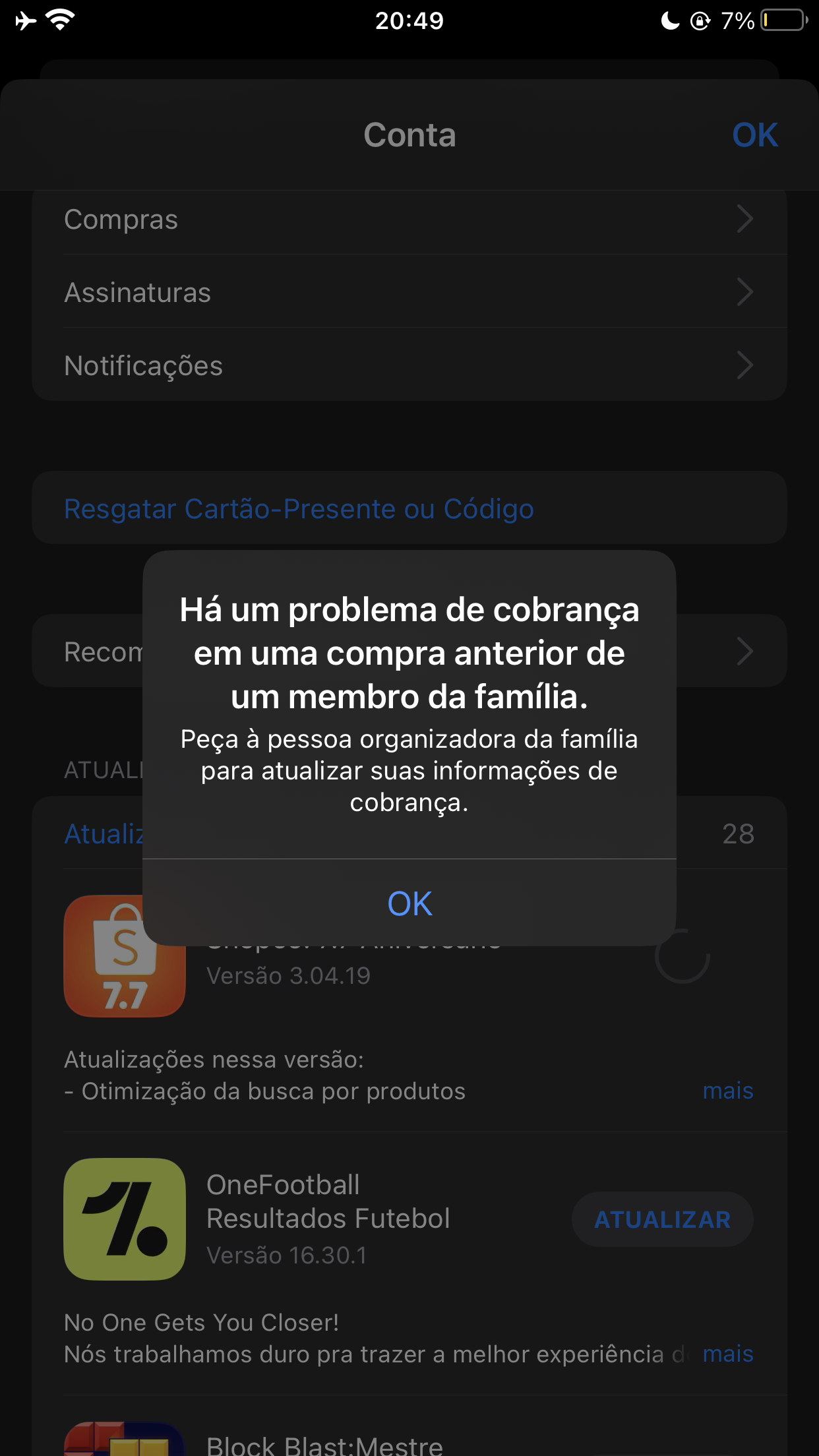 Se você for o organizador da família, você é quem gere o método de pagamento, então precisa cadastrar um método de pagamento ativo e com limite para conseguir atualizar seus apps ou pedir para a pessoa que está na sua família efetuar o método de pagamento.