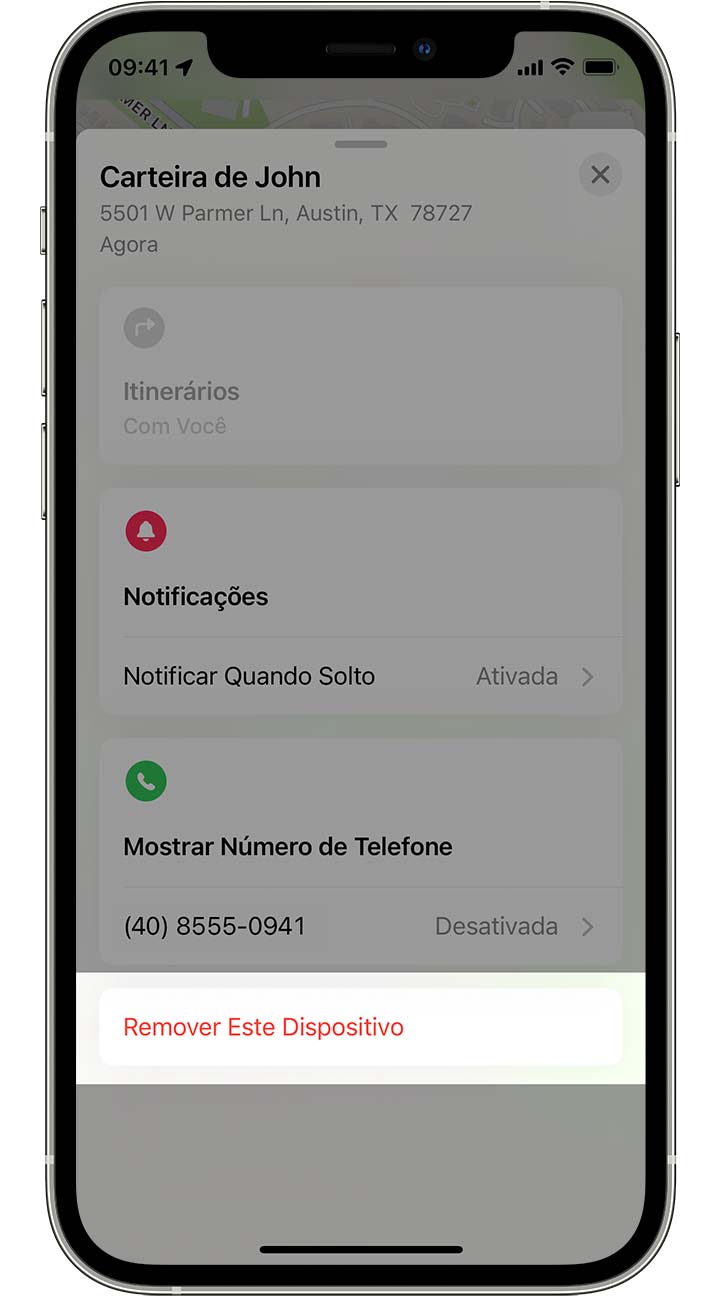 Depois que a carteira de couro para iPhone for adicionada a Dispositivos, você poderá ver a localização dela, ativar o Modo Perdido ou optar por receber uma notificação se ela soltar do iPhone.