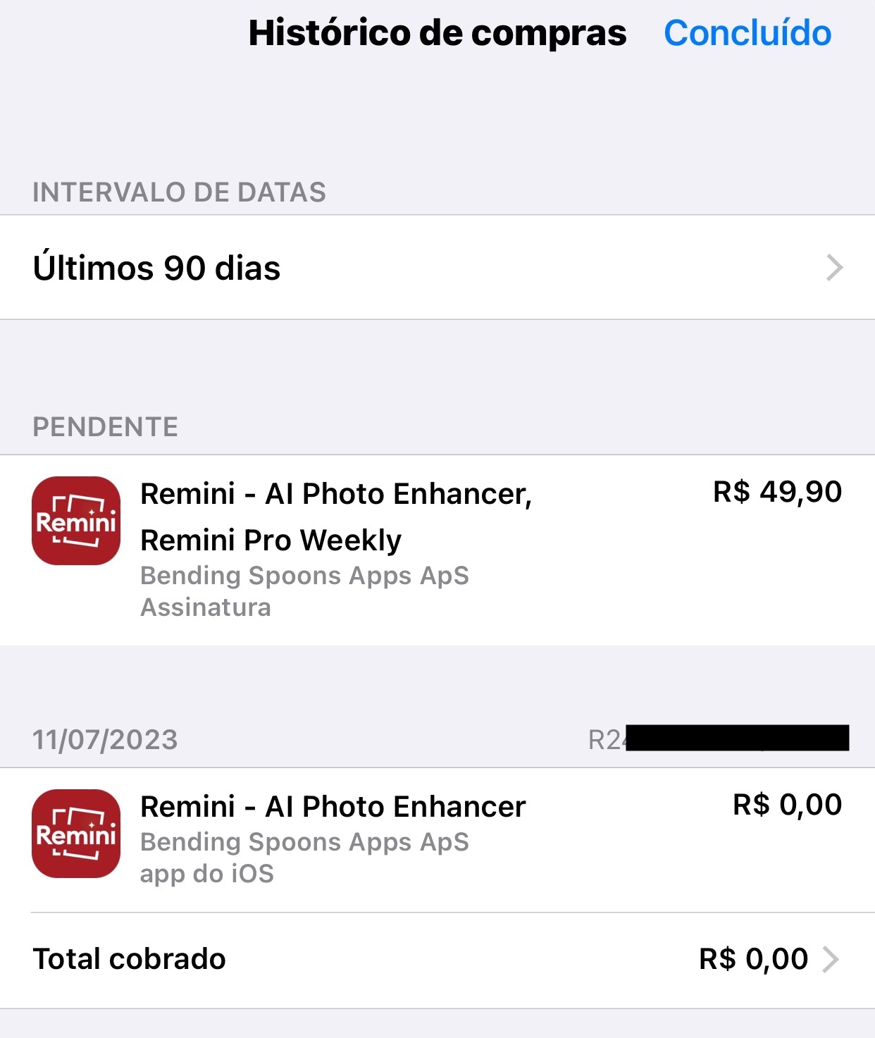 Olá gostaria de informações sobre uma compra que meu irmão menor de idade fez dentro do aplicativo Remini, assim que vi cancelei na hora a assinatura mas mostrou no meu cartão que tinha sido cobrado, e no histórico de compras ( no ajuste da conta ) App Store mostra que está pendente pq eu faço?