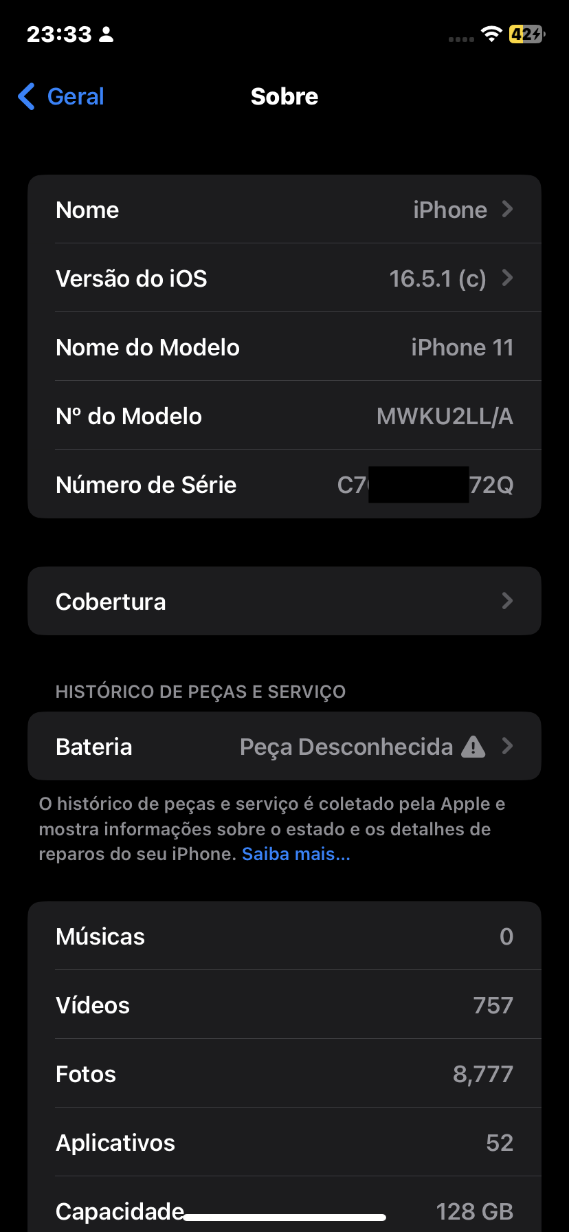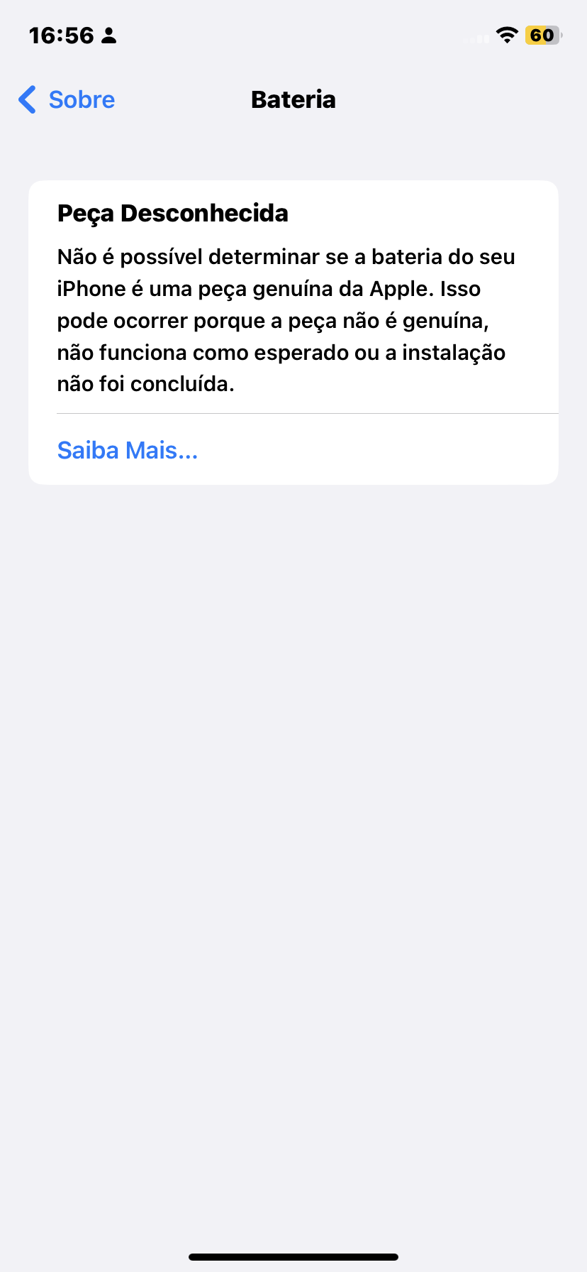 Com o iOS 15.2 e posterior e iPhone XR, modelos de iPhone XS e posterior, incluindo iPhone SE (2ª e 3ª gerações), você pode acessar Ajustes > Geral > Sobre para obter o histórico de peças e serviços do iPhone. Você também pode descobrir se a bateria foi substituída. Se a substituição tiver sido feita usando procedimentos e peças originais da Apple, você verá a mensagem "Peça Genuína da Apple" ao lado da Bateria. Se o iPhone não foi reparado, esta seção não aparecerá.
