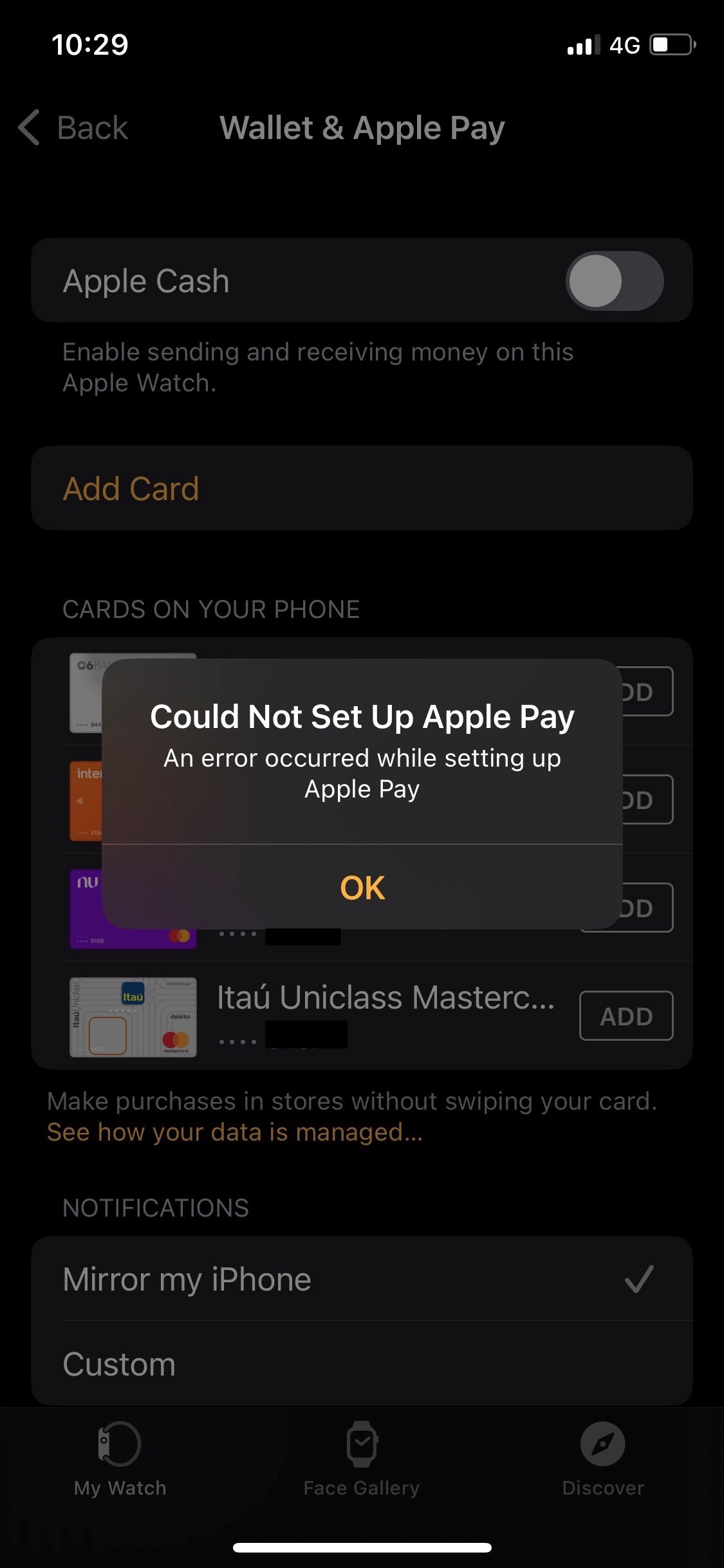 Não estou conseguindo adicionar meus cartões de crédito no apple watch, porém estão todos adicionados normalmente na minha carteira wallet do iphone, já reiniciei os dois dispositivos tanto na apple watch quanto no iphone xs lembrando que os dois estão atualizados com a última versão que saiu, apple watch series 4 watchos 9.6 e o iphone xs ios 16.6 já pesquisei todoas as maneiras de tentar resolver esse problema, já desparelhei o watch, já reiniciei, já troquei a linguagem e região e mesmo assim o erro persiste, sempre aparece a informação "Could Not Set Up Apple Pay An error occurred while setting up Apple Pay"