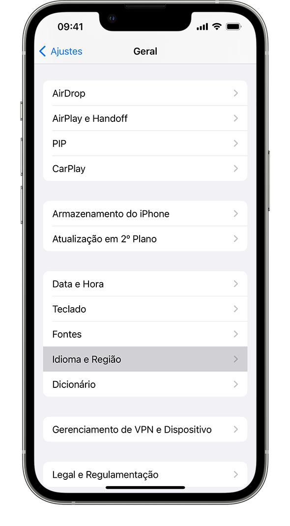 Selecionar "Idioma e Região"