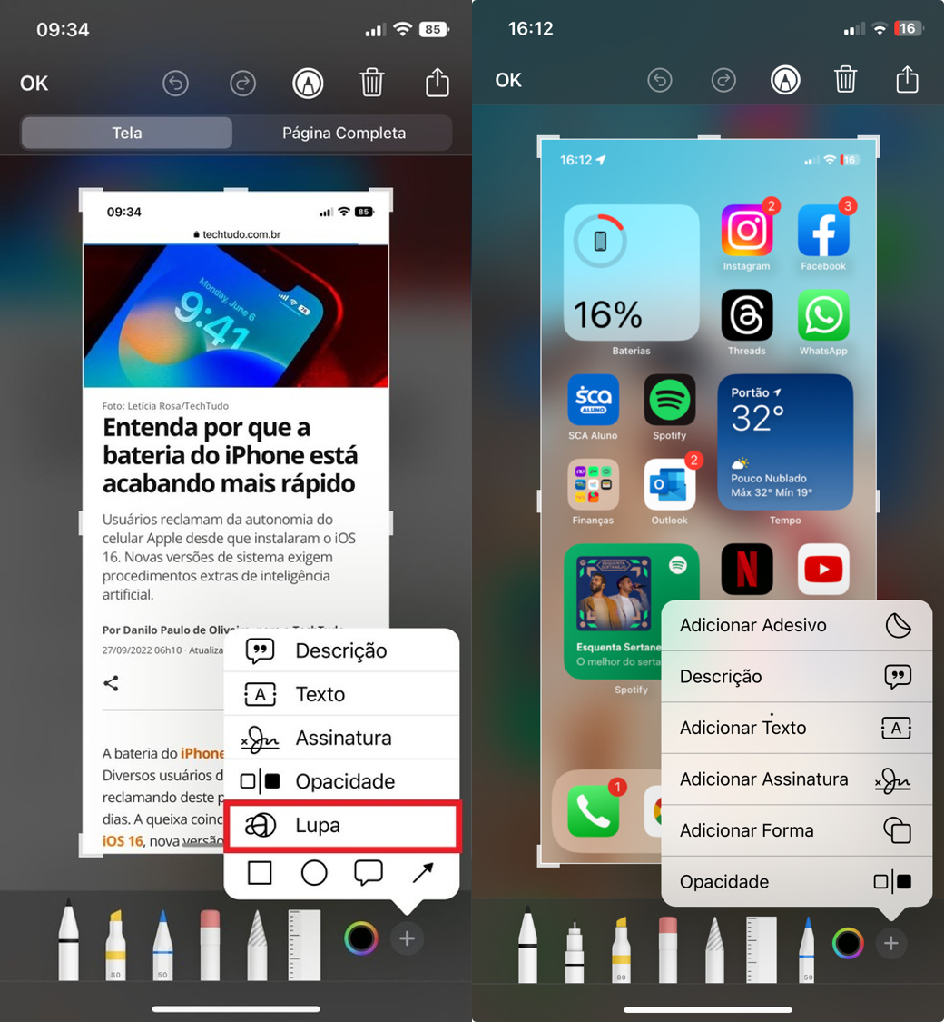 Onde está a opção de incluir lupa em printscreen no IOS 17 ?