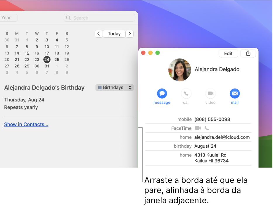 - Para fazer com que janelas adjacentes tenham o mesmo tamanho, arraste a borda que deseja redimensionar. Conforme ela se aproxima da borda da janela adjacente, elas se alinham.