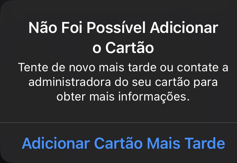 - Entre em contato com seu banco ou emissor do cartão se receber as seguintes mensagens de erro ao adicionar um cartão ao app Carteira da Apple: