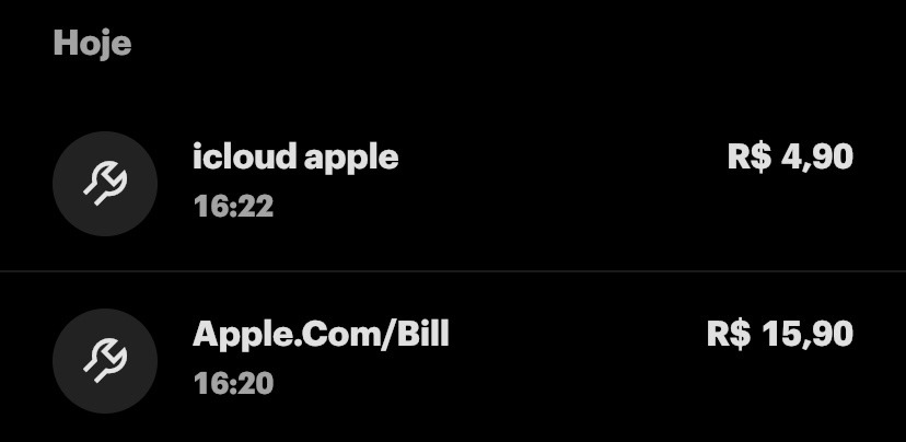 Fiz a assinatura básica do Icloud, de R$4,90 e estava dando tudo certo, então decidi trocar o cartão de cobrança porque o antigo havia sido cancelado e eu não estava mais renovando a assinatura. Assim que eu troco o cartão e renovo a assinatura, vejo no aplicativo do banco a parcela comum de R$4,90 e uma de R$15,90 que desconheço.