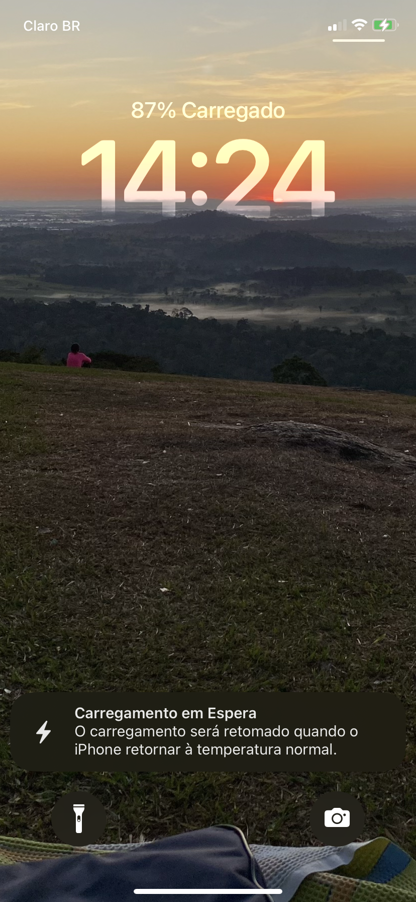 Esta mensagem aparece na Tela Bloqueada e em Ajustes > Bateria: "Carregamento em Espera. O carregamento será retomado quando o [dispositivo] retornar à temperatura normal."
