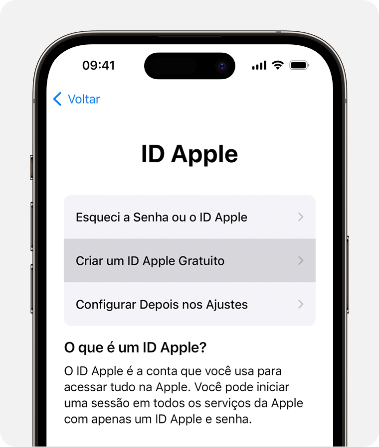 Você pode criar um ID Apple ao configurar o dispositivo ou criá-lo mais tarde na App Store.