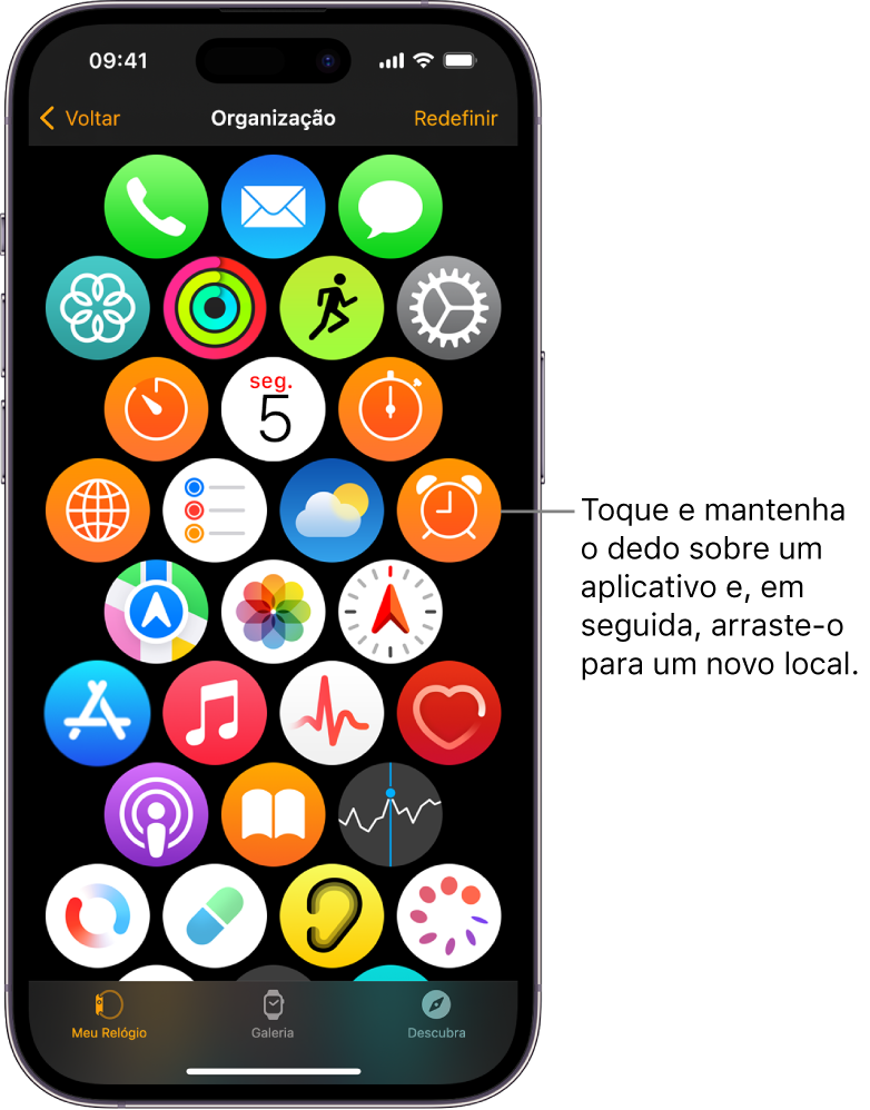 Ou abra o app Apple Watch no iPhone, toque em Meu Relógio, toque em “Visualização de Apps” e toque em Organização. Toque e mantenha o dedo sobre um ícone de app e arraste-o para um novo local.