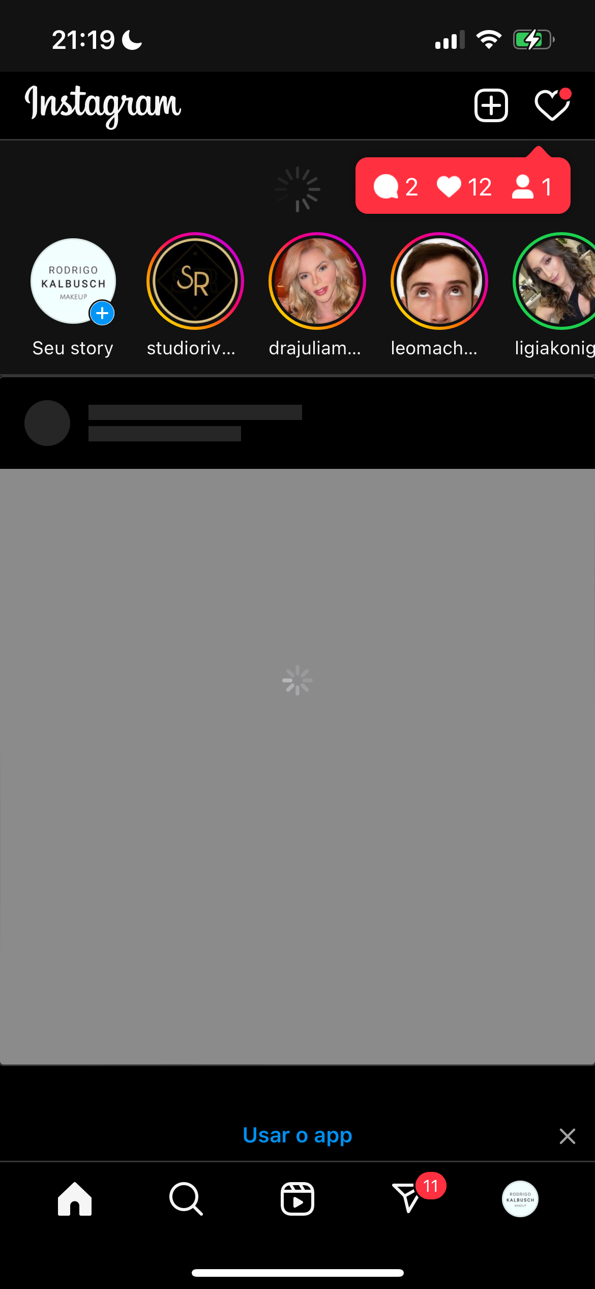 O app do Instagram não carrega ele abre até as vezes mostra umas mensagens de erro ou não aparece nada. Já atualizei, desinstalei e instalei várias vezes o app e não muda nada.