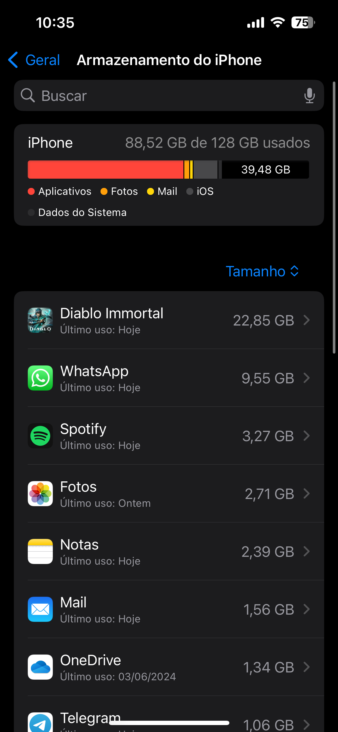 Em ajustes, geral, armazenamento do iphone, entre a imagem que mostra o espaço utilizado por aplicativos, fotos, Mail, iOS e dados, e o detalhamento do tamanho e último uso de cada aplicativo, existe uma opção com botão chamada:
