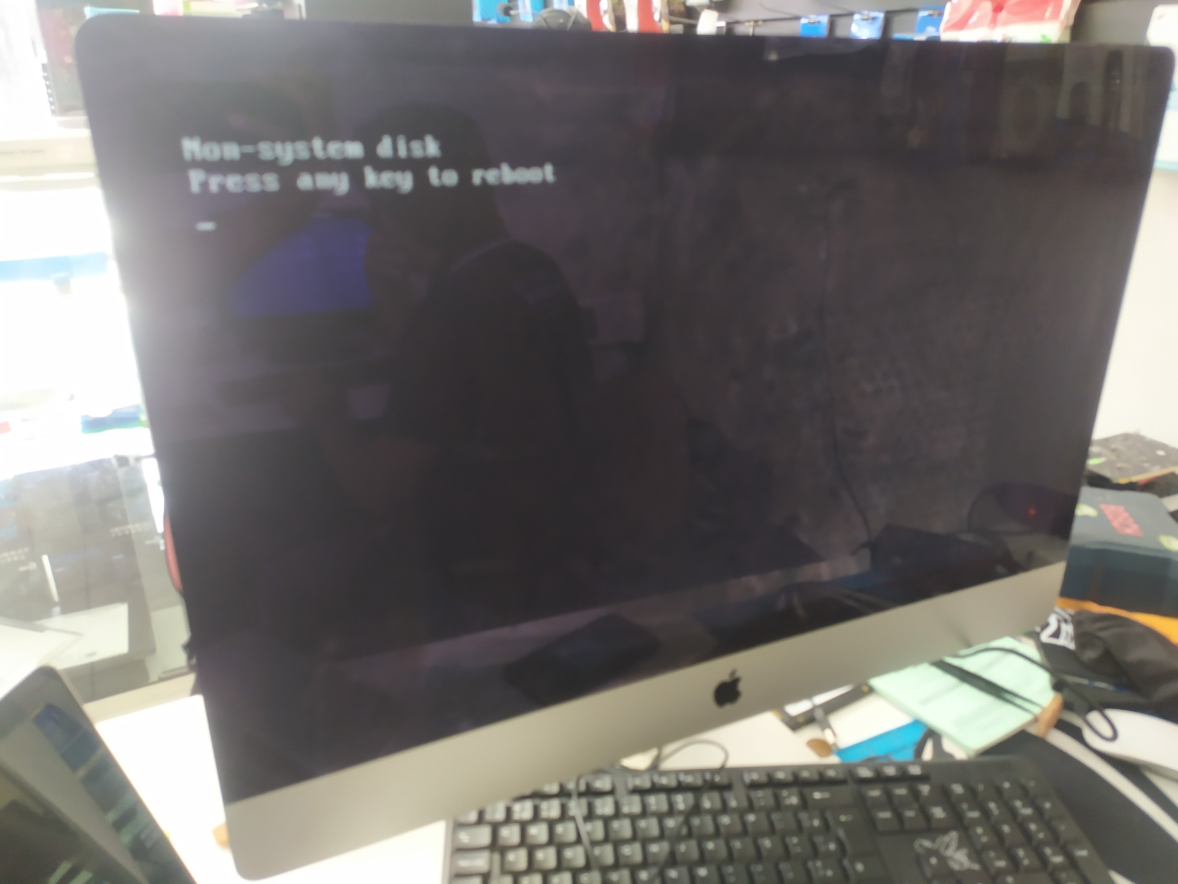 Eu estava fazendo a manutenção de meu imac, trocando o hd por um ssd, memoria ram e processador, ate la tudo bem, fiz a restauração, instalei o catalina e processo tudo muito bem, porém, fui tentar reinstalar o windows 10 em meu imac através do boot camp, no inicio deu tudo certo mais quando foi pro quadro do windows ele permaneceu naquela tela por duas horas, pensando eu que ele tinha travado no download da tela azul então decidi desligar e ligar, mais quando fiz isso meu imac liga e vai pra uma tela preta do windows com a seguinte frase "non-system disk, press any key to reboot". Ja tentei de tudo, comandos para voltar para o catalina e boot camp ao reiniciar ele, videos comandos também do windows, não sei mais o que fazer. Obs: tenho o teclado original e o mouse do imac.