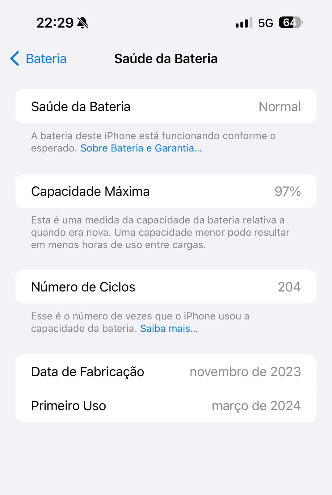 Minha saúde da bateria está diminuindo muito rápido, 5 meses de uso já está em 97%