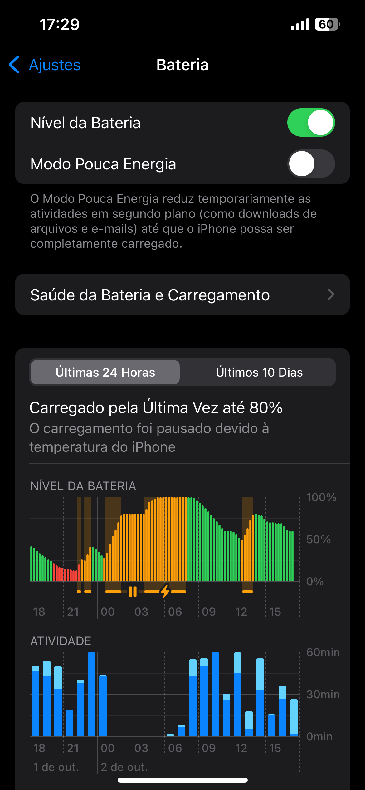 Olá Usuario(a), Aqui é a comunidade Apple de usuários ajudando outros usuários iguais a você. O laranja significa que o iPhone estava carregando com uma uma fonte de energia de pouca velocidade Se minha orientação/ajuda foi útil, não deixe de curti Espero ter ajudado! Atenciosamente Dav3 G®️0hl666 Este site apresenta conteúdos enviados por usuários, comentários e opiniões apenas para fins de informação. A Apple poderá fornecer ou recomendar respostas como uma solução possível com base nas informações fornecidas. Cada possível problema poderá envolver diversos fatores não especificados nas conversas capturadas em um fórum eletrônico; sendo assim, a Apple não pode garantir a eficácia de quaisquer soluções sugeridas nos fóruns da comunidade. A Apple isenta-se de toda e qualquer responsabilidade por atos, omissões e conduta de terceiros em conexão com o uso do site ou relacionados a ele. Todas as publicações e todo o uso de conteúdo do site estão sujeitas aos Termos de Uso da Comunidade de Suporte da Apple. Veja como os seus dados são gerenciados…