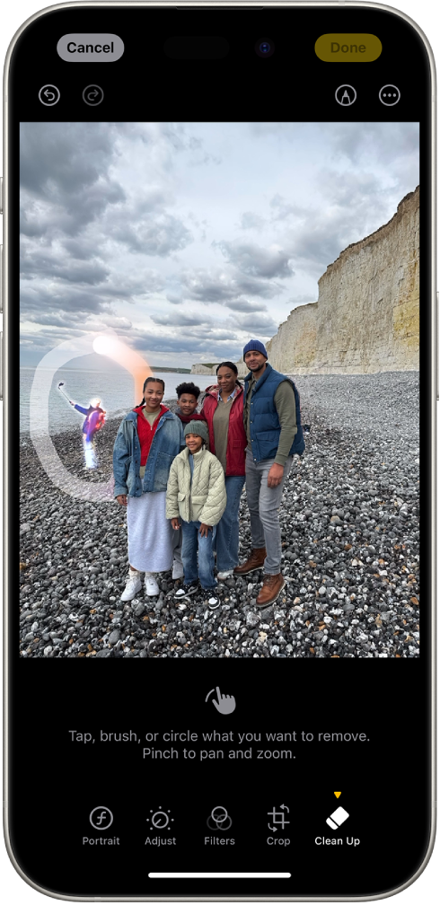 Use a ferramenta Limpeza para identificar e remover objetos que causam distração do fundo de uma foto.