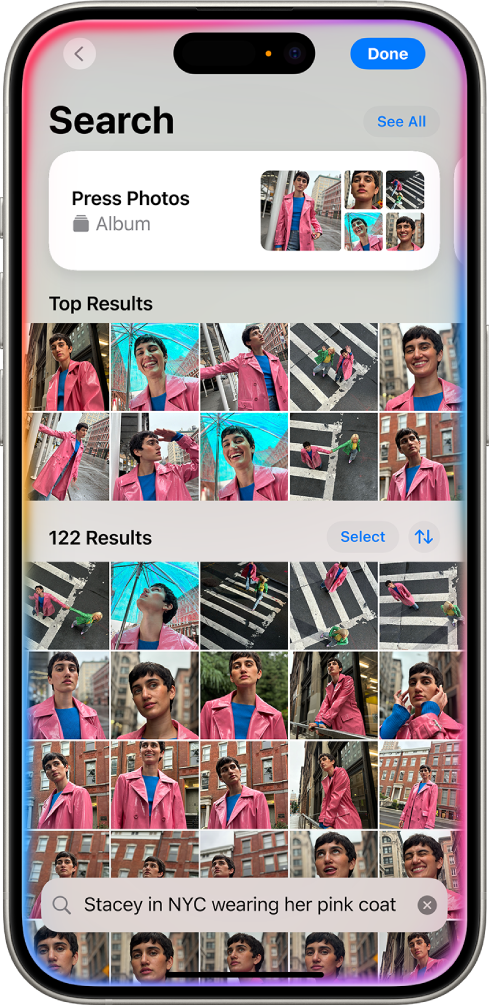 A Apple Intelligence facilita ainda mais a busca de uma foto específica ou momento principal de um vídeo — basta você descrever o que deseja encontrar.