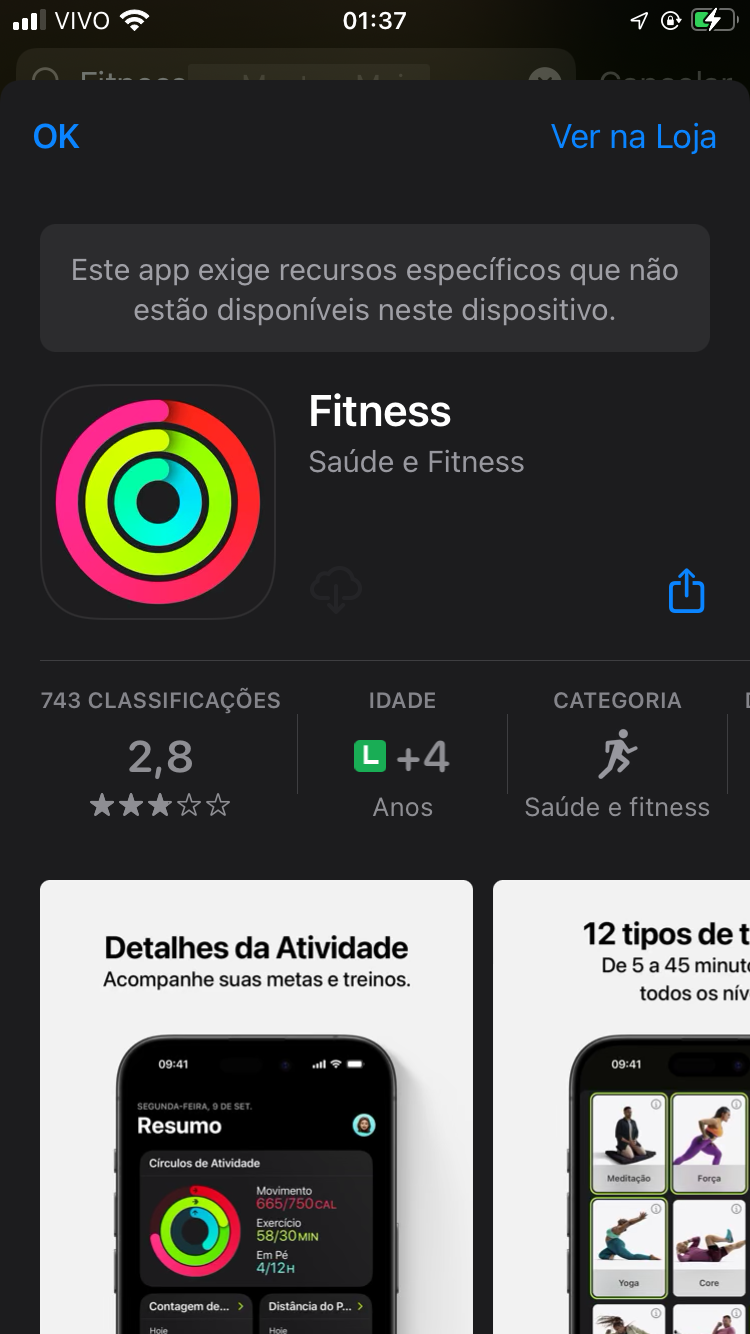 infelizmente, você não conseguirá instalar o app Fitness em seu dispositivo. O app Fitness foi projetado para dispositivos com o iOS 16 ou posterior.