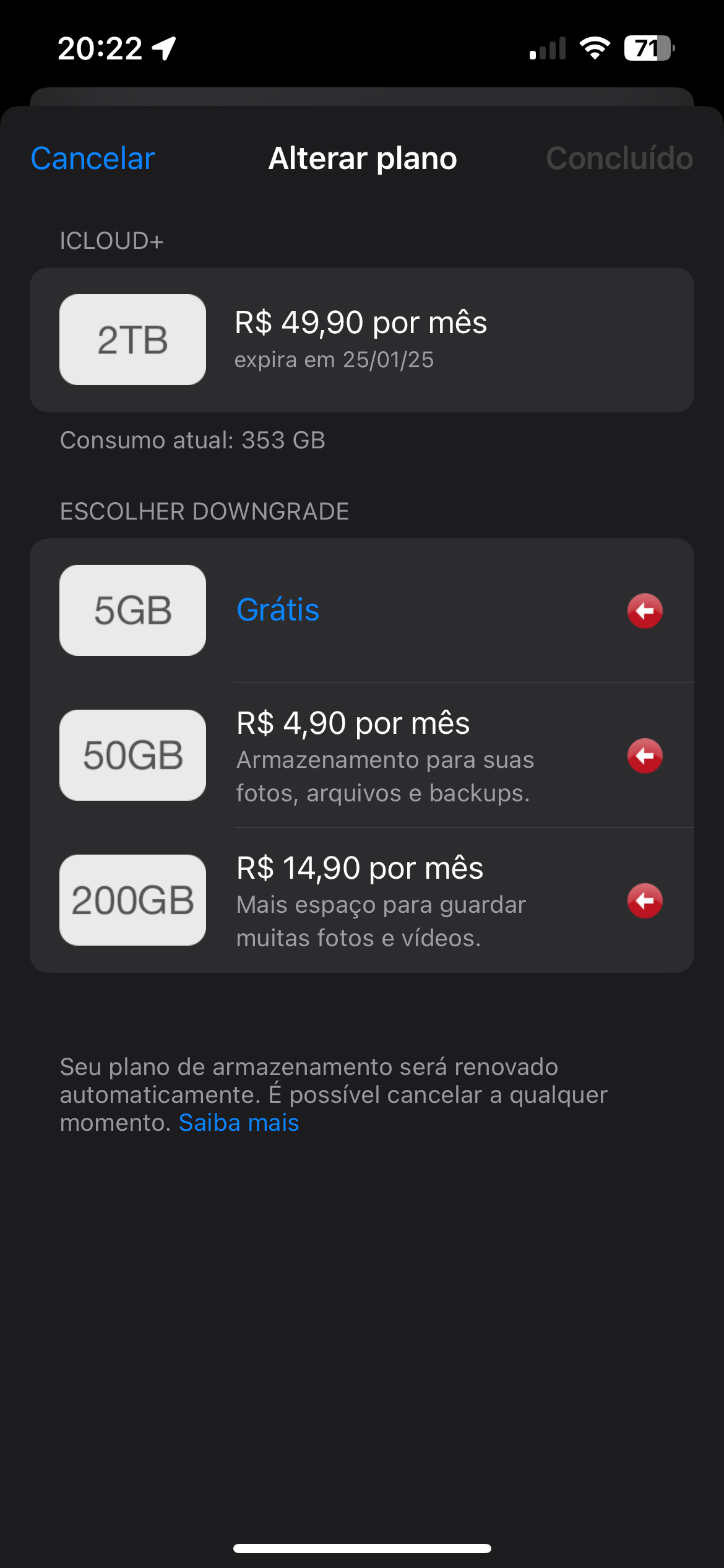 Tenho o iPhone 13 e atualmente assino o plano de 2TB e tentei fazer Downgrade do iCloud para 5GB, ficou carregando e carregando e NADA! Fui fechar e tentar novamente e não consigo concluir a ação . Como proceder ? Quero cancelar agora !