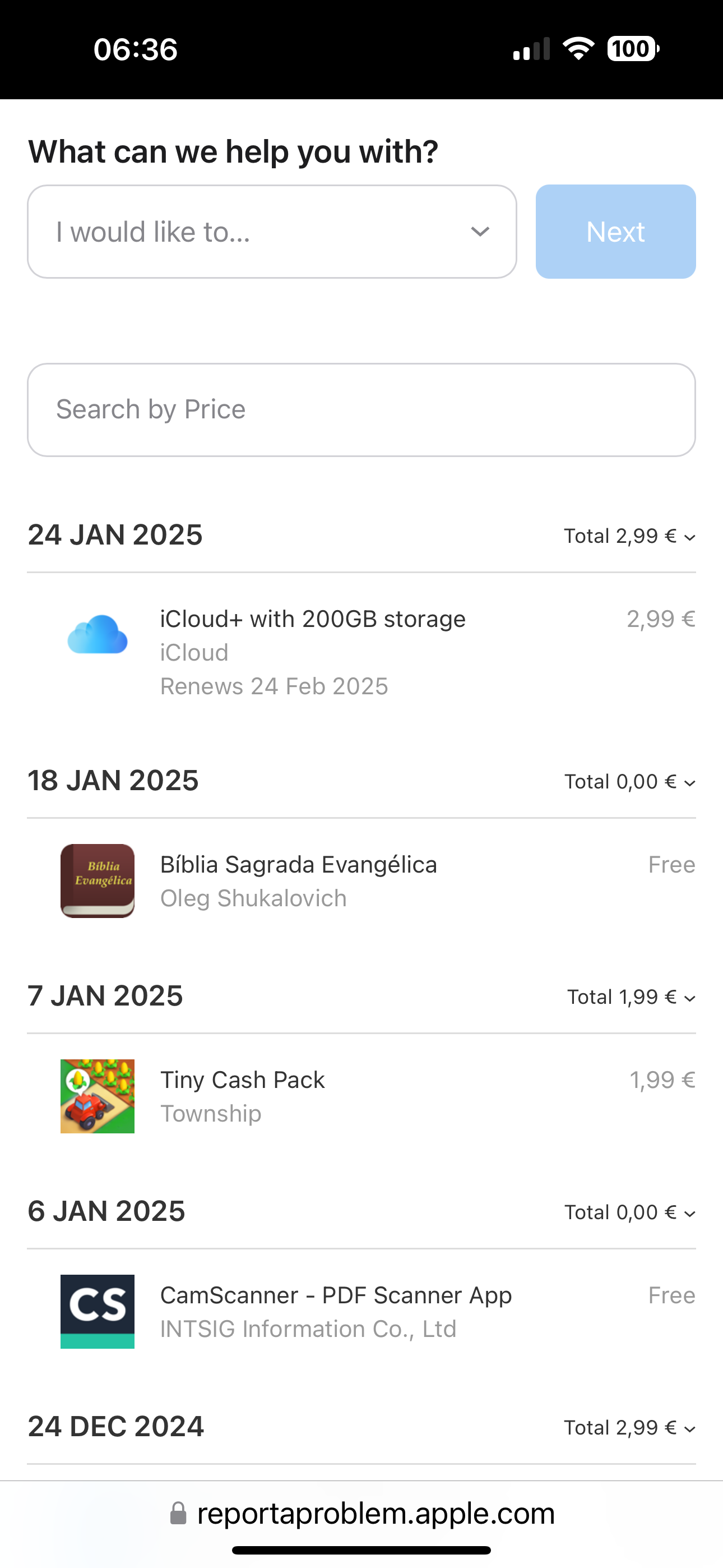 iPhone mostrando o site Relatar um problema, onde você pode solicitar um reembolso. Depois de selecionar "Solicitar um reembolso", escolha o motivo pelo qual você está solicitando o reembolso.