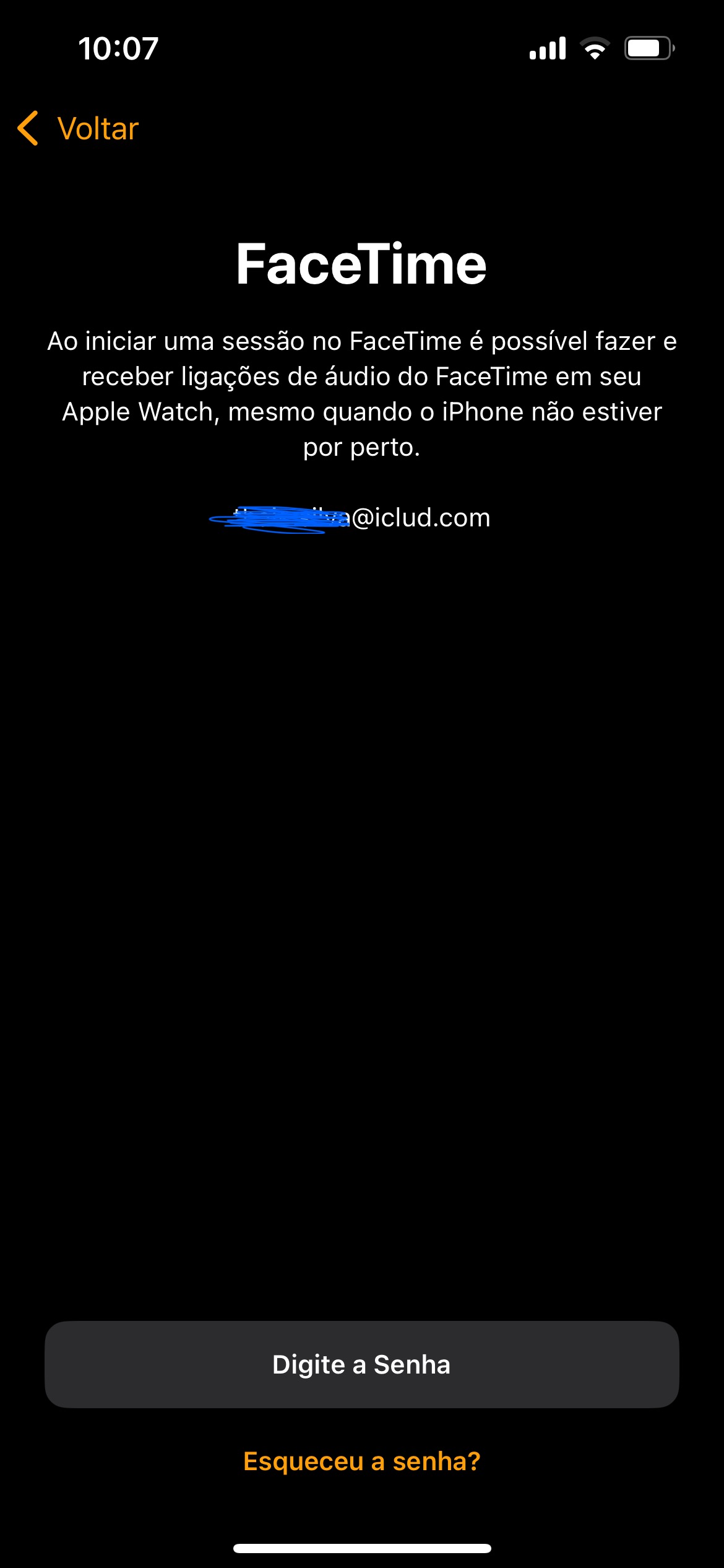 Se solicitado, insira sua senha da Conta Apple. Caso não seja solicitada, você poderá iniciar sessão posteriormente usando o app Apple Watch: toque em Geral > Conta Apple e inicie uma sessão. Alguns recursos que exigem um número de telefone celular só funcionarão nos modelos Cellular do Apple Watch se você iniciar sessão no iCloud.