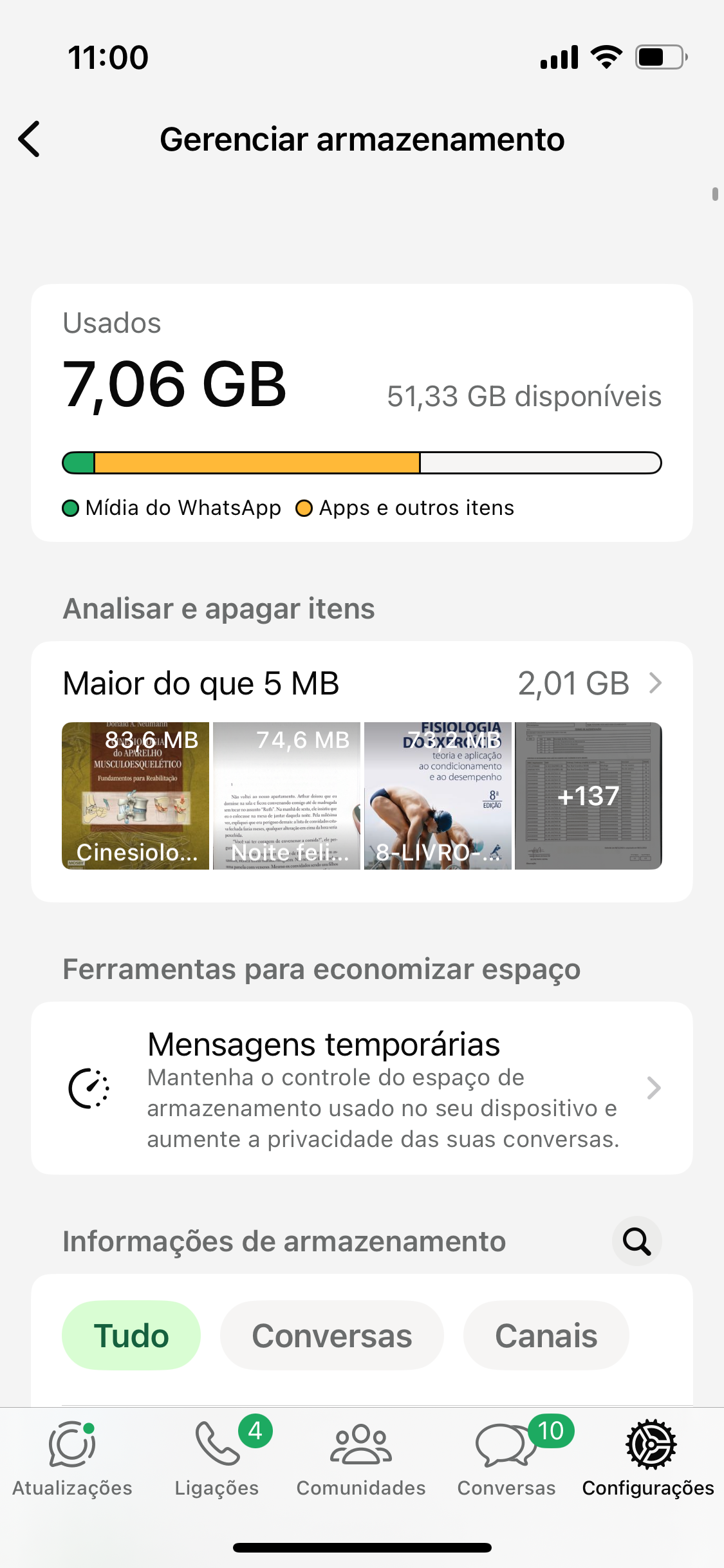 - No WhatsApp, vá em Configurações > Armazenamento e Dados > Gerenciar Armazenamento.