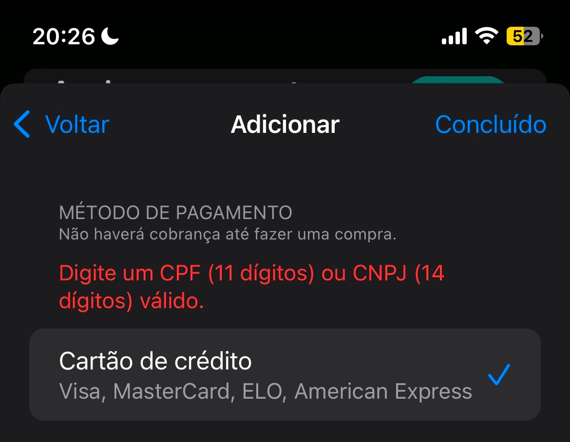 boa noite. Estou com problemas na mudança do método de pagamento do i cloud. Quando coloco meus dados da CPF inválido, sendo que meu CPF está válido e correto. Gostaria de ajuda pois meu celular esta com apps sem funcionar por falta de memória.