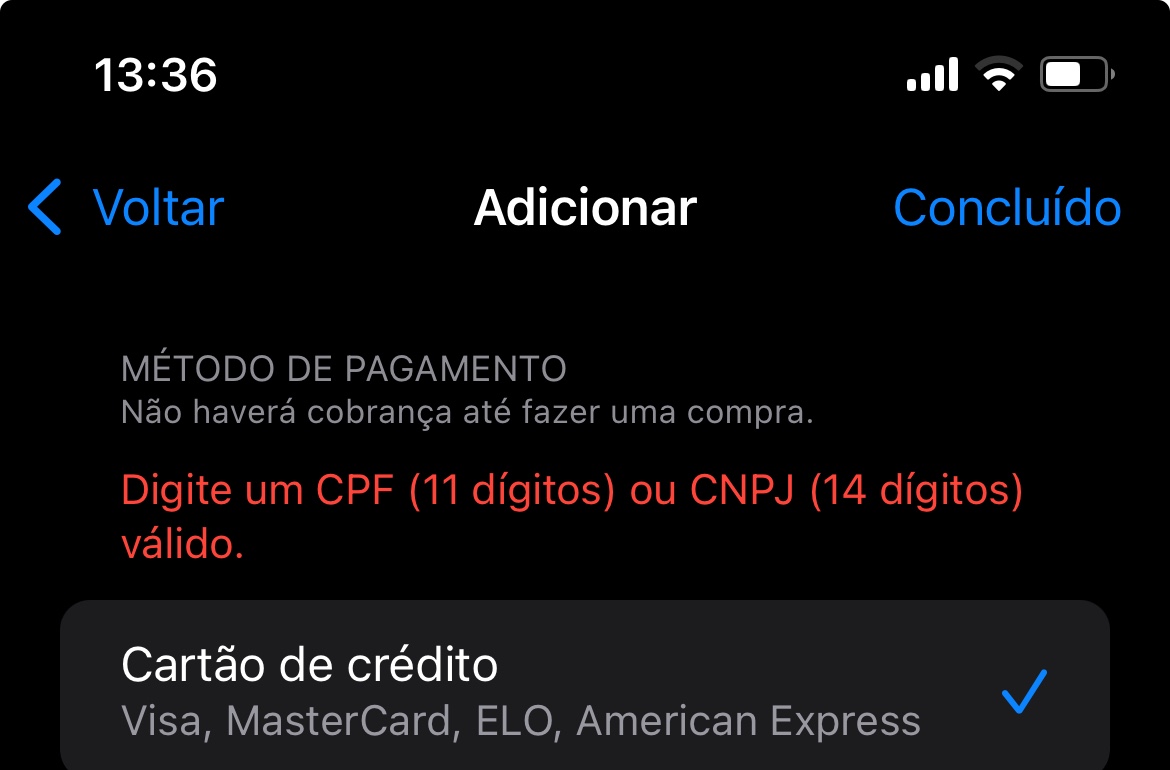 ao iniciar sessão com seu ID Apple e senha, vá para as configurações de pagamento e tente adicionar o seu CPF.