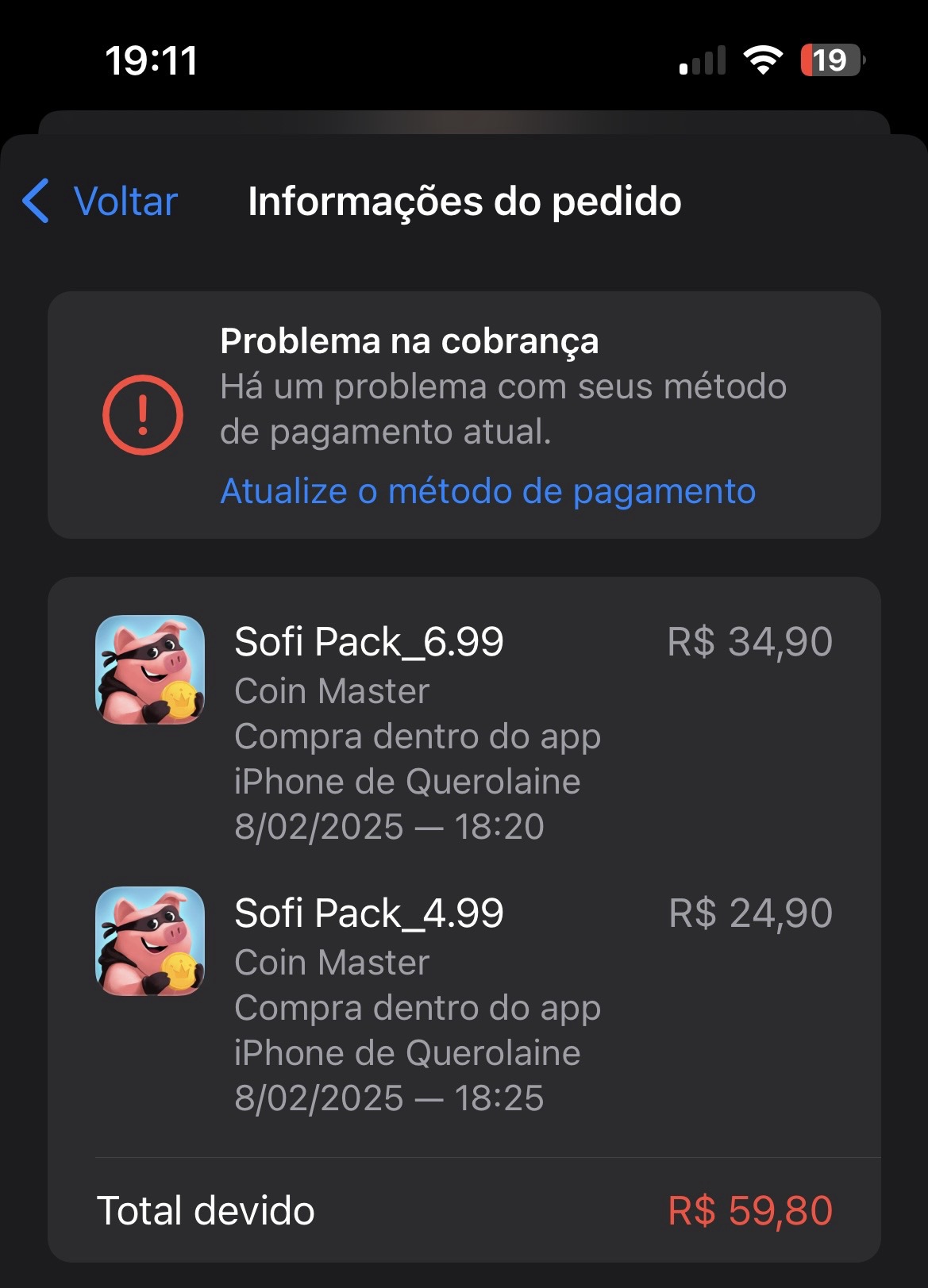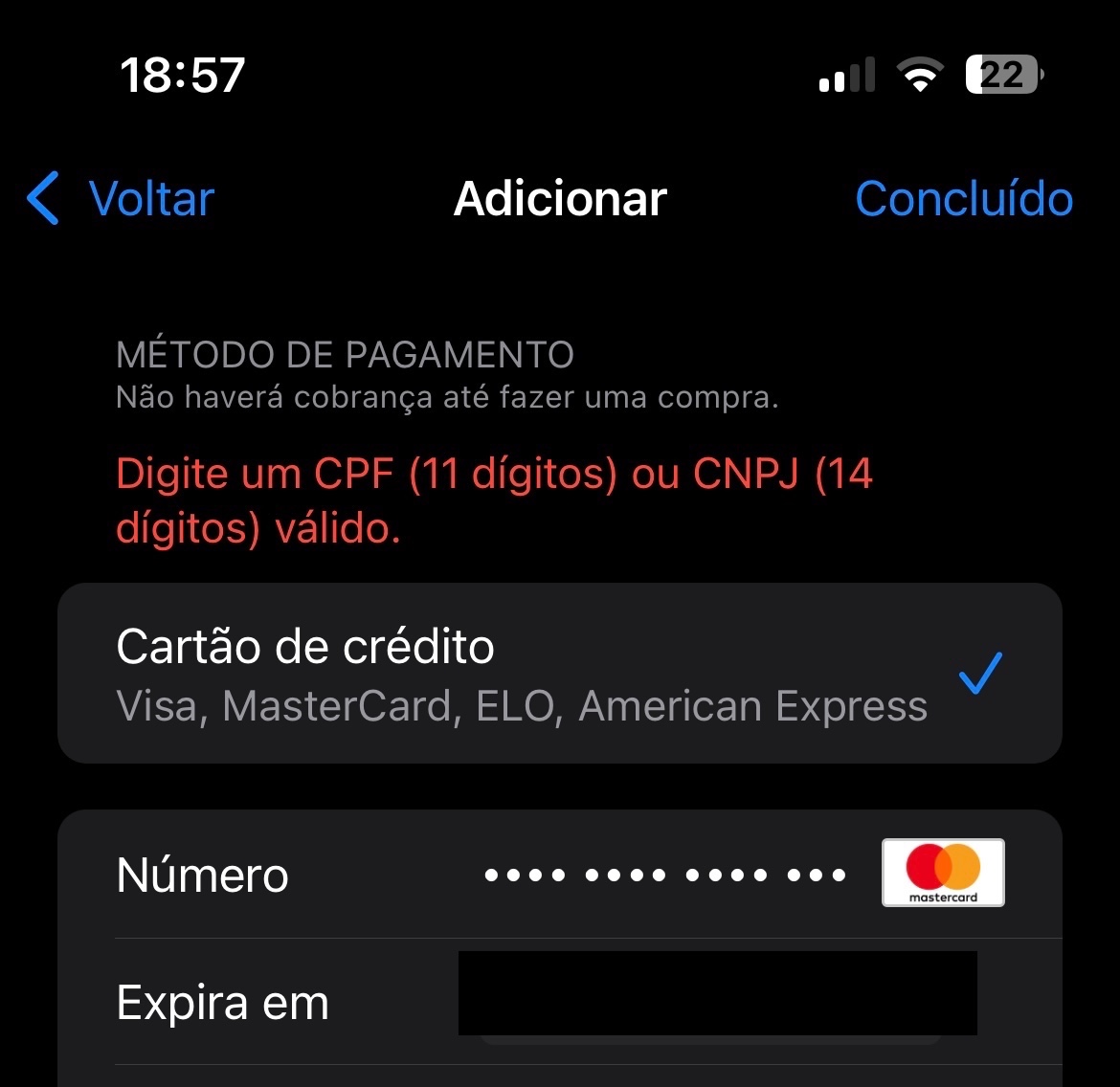 tenta pelo site https://account.apple.com/, insira outro cartão que seja seu e se continuar, aguarde pois não ha solução ainda