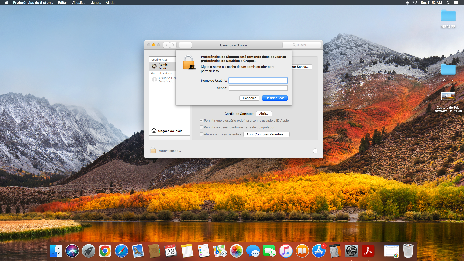 Ao tentar adicionar um nome usuário ao meu Mac (Versão 10.13.6) através do caminho: Apple > Preferências do Sistema > Usuários e Grupos, apareceu a informação para adicionar o Nome de Usuário e Senha. Adicionei o nome de usuário e a senha que uso ao iniciar/logar/desbloquear o meu Mac; porém este mesmo nome de usuário e senha não desbloquearam as preferências de usuários e grupos, bem como todas as outras opções que requer essa autenticação (clicando no cadeado para fazer alterações).