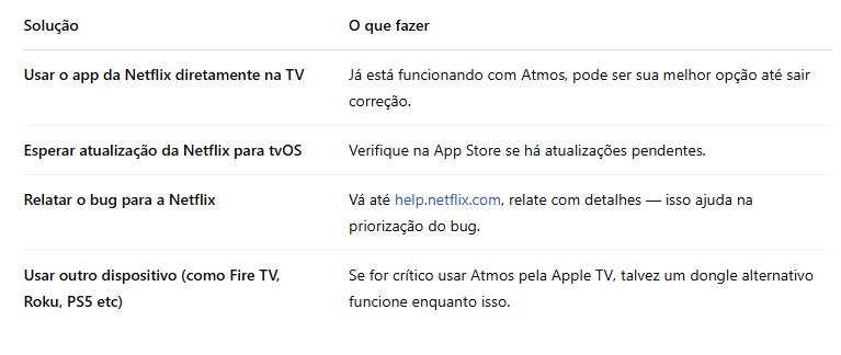 Atualmente (abril de 2025), há relatos consistentes de que o app da Netflix para Apple TV (tvOS) não envia sinal Atmos corretamente em alguns casos, mesmo com tudo certo no sistema. Isso acontece principalmente quando: