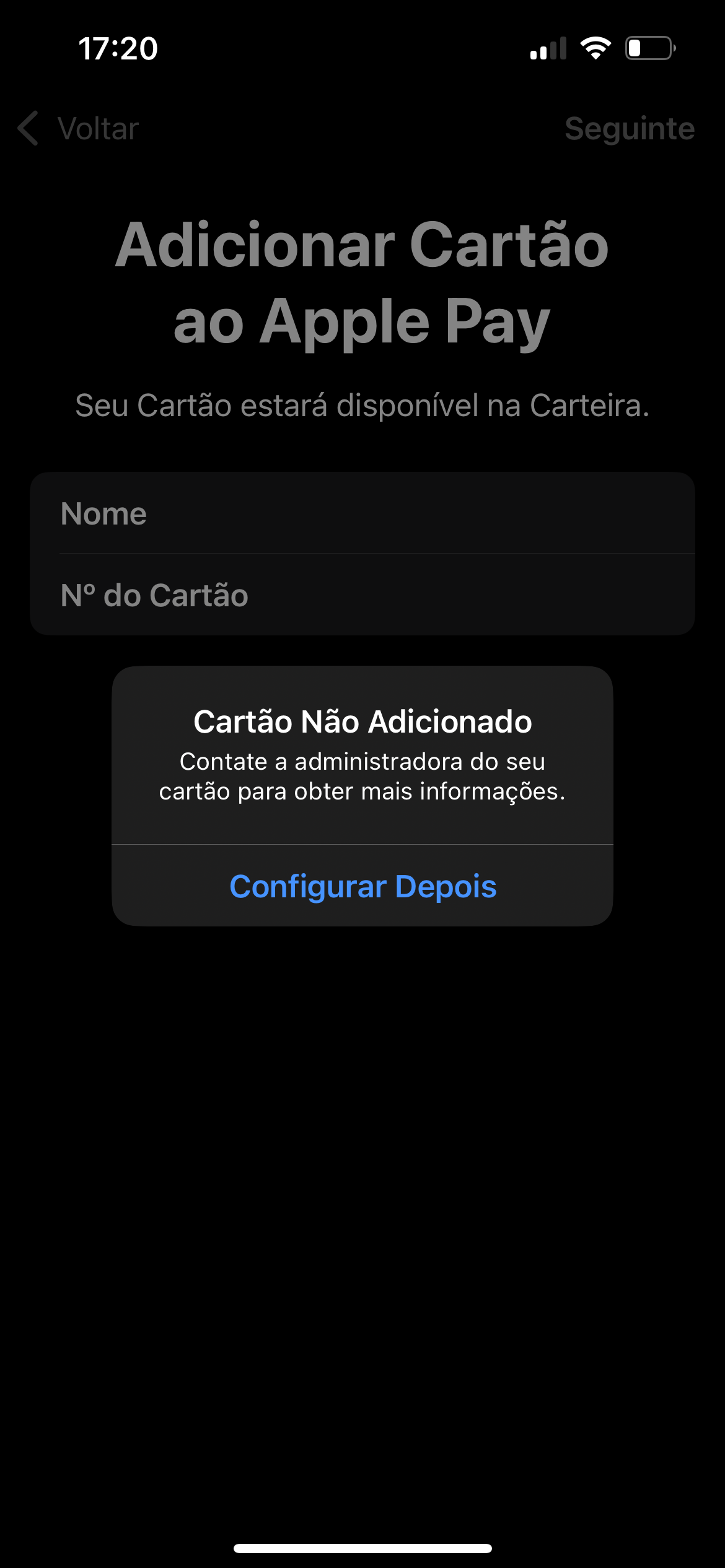 Não estou conseguindo adicionar cartões para pagamentos pelo Apple Pay. (Obs: cartões são compatíveis)
