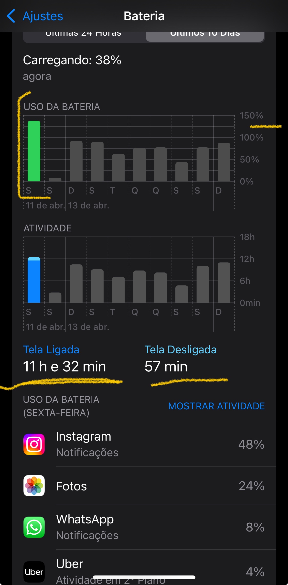 Aí na parte que mostra meu uso com a tela ligada e desligada dá, somando, cerca de 12h30 nesse dia, tendo gastado com isso toda a bateria mais uns 30% depois de ter recarregado.
