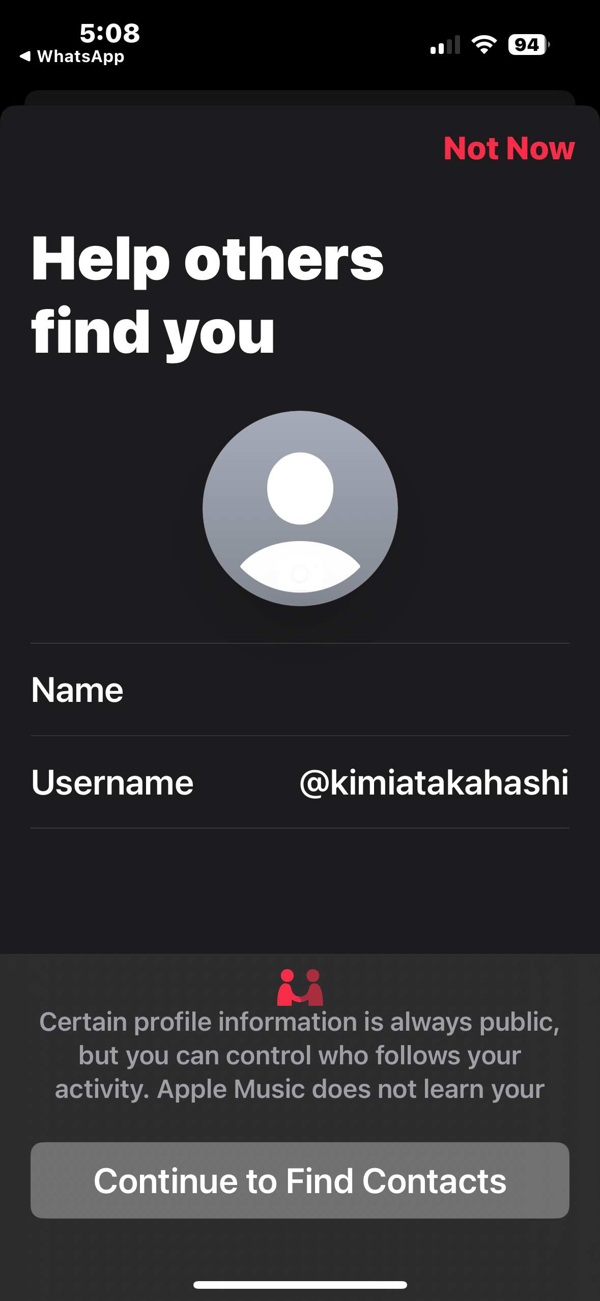 assinei o plano familiar do apple music e nao consigo ter acesso nem configurar o meu perfil publico, a assinatura esta paga e o apple id esta certo, mas nao consigo seguir amigos nem ter acesso a suas playlists; quando consegui ter acesso ao perfil de um amigo via link me encaminhado e pedi para seguir, foi essa tela que apareceu (imagem 1), preenchi o que foi pedido e quando fui adicionar amigos, essa tela apareceu (imagem 2). minha tela inicial no app é essa (imagem 3), no lugar que deveria estar a minha imagem de perfil, esta esse simbolo vermelho, e quando aperto nele, aparece essa tela (imagem 4). cheguei a conclusao de que estou com problema em criar ou/e configurar meu perfil publico no apple music.