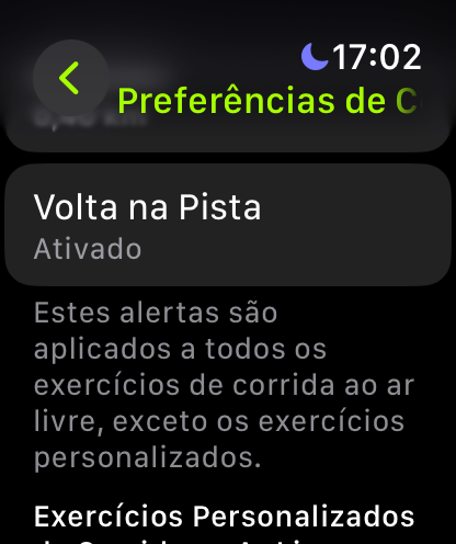 3. Alertas Específicos por Volta: É aqui que a descrição da sua foto entra. A frase "Estes alertas são aplicados a todos os exercícios de corrida ao ar livre" significa que, quando esta função está ativa na pista, você receberá notificações a cada volta completada, mostrando o tempo daquela volta, seu ritmo, etc. Isso permite que você tenha um feedback imediato sobre seu desempenho em cada trecho de 400m.