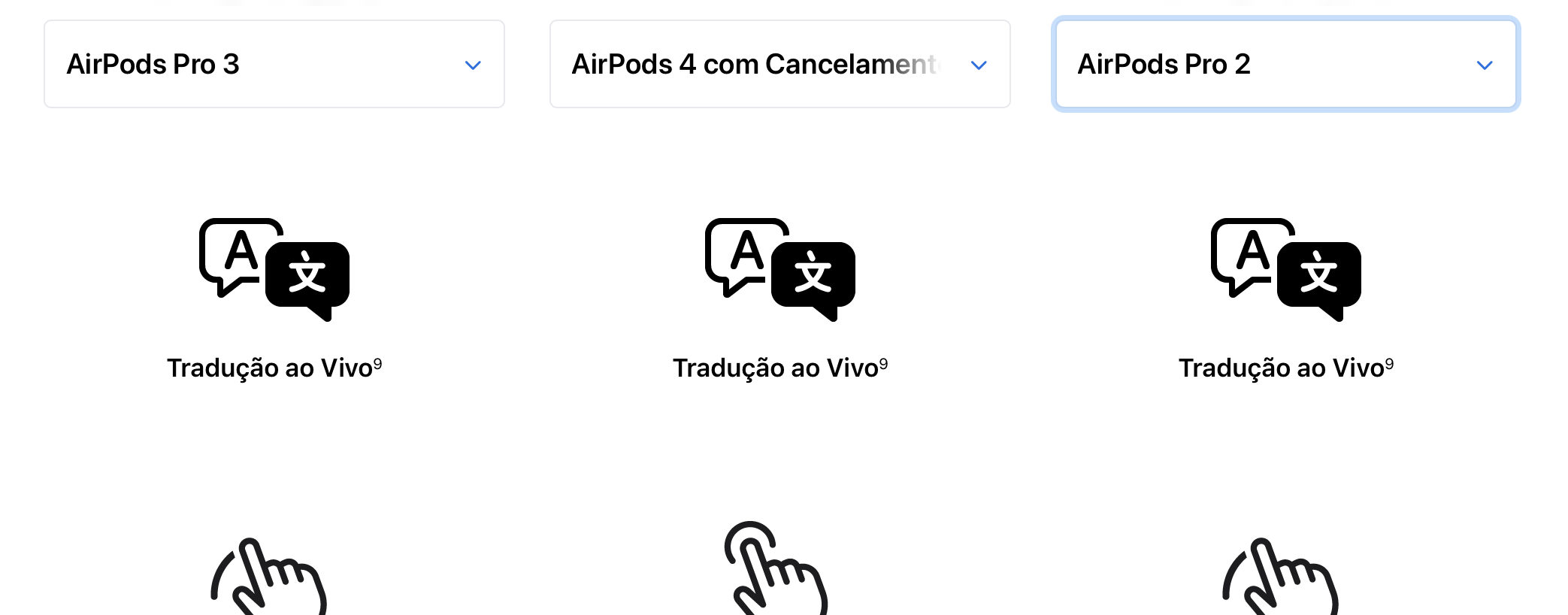 "A Tradução ao Vivo com AirPods está disponível nos AirPods 4 com Cancelamento Ativo de Ruído e AirPods Pro 2 e posteriores com o firmware mais recente quando emparelhados com um iPhone com iOS 26 e posterior com a Apple Intelligence ativada. Disponível em versão beta nos seguintes idiomas: português (Brasil), inglês (Reino Unido, EUA), francês (França), alemão (Alemanha) e espanhol (Espanha). Ainda este ano, a Tradução ao Vivo nos AirPods estará disponível em chinês simplificado, italiano, japonês e coreano. Alguns recursos podem não estar disponíveis em todas as regiões ou idiomas. Para mais informações, consulte a Disponibilidade de recursos.A Tradução ao Vivo não está disponível na União Europeia."