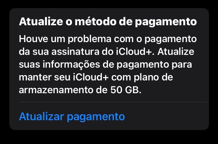 Recebo uma notificação, avisando que não foi possível efetuar o pagamento da minha assinatura, e pedindo para atualizar o método de pagamento, mas aí que tá o problema, eu atualizo, mas sempre dá o mesmo problema. Coloco todas as informações certas, mas o pagamento não consegue ser efetuado de jeito nenhum.