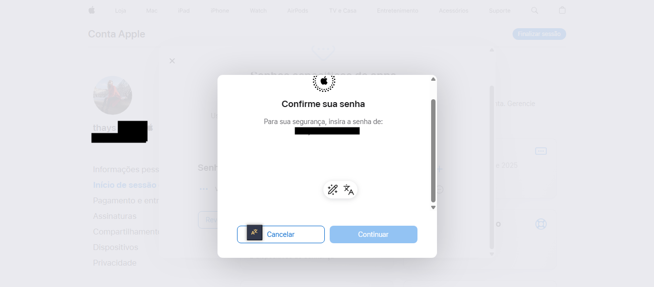 Insira ou cole a senha específica do app no campo de senha do app ao iniciar sessão na Conta Apple.