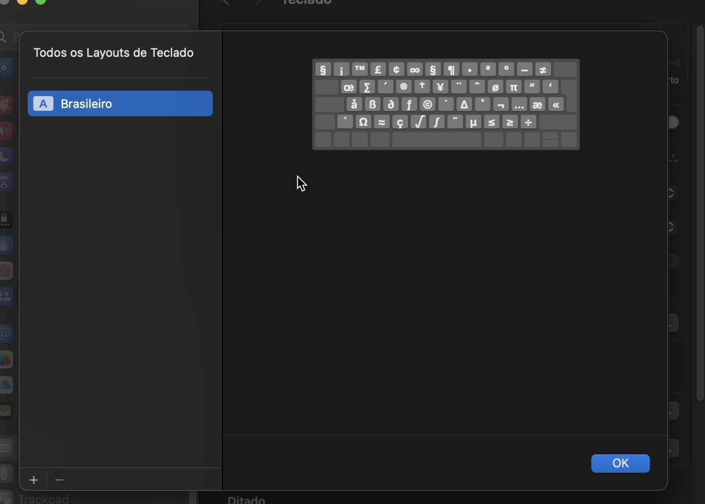 - Use o botão de "Adicionar" (+) para encontrar o layout Brasileiro (ABNT2) e o selecione.