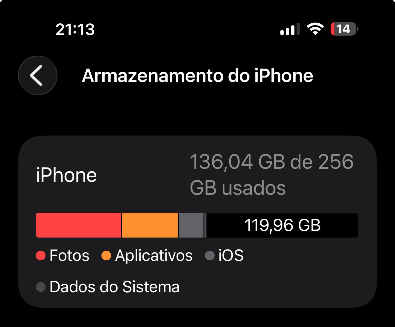 Tenho um iPhone 16 PRO MAX 256GB com 119,96GB livre e iCLoud com plano de 50GB com 18,7Gb livre.