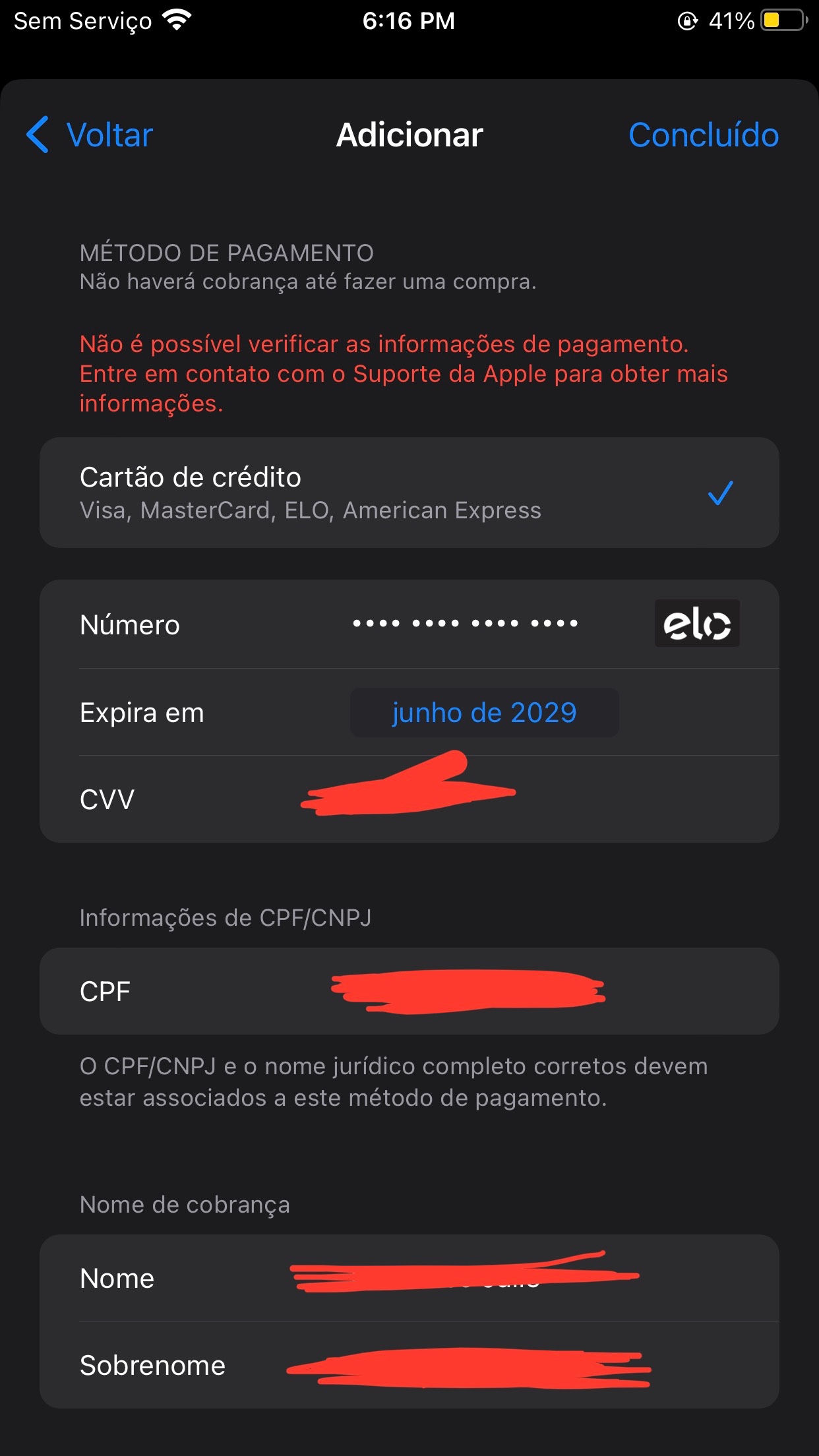 Já verifiquei todos os dados do cartão, o CVV, a data de validade, e o meu CPF e nome de cobrança diversas vezes. Parece que o erro ocorre na verificação destes dados pelo sistema da Apple.