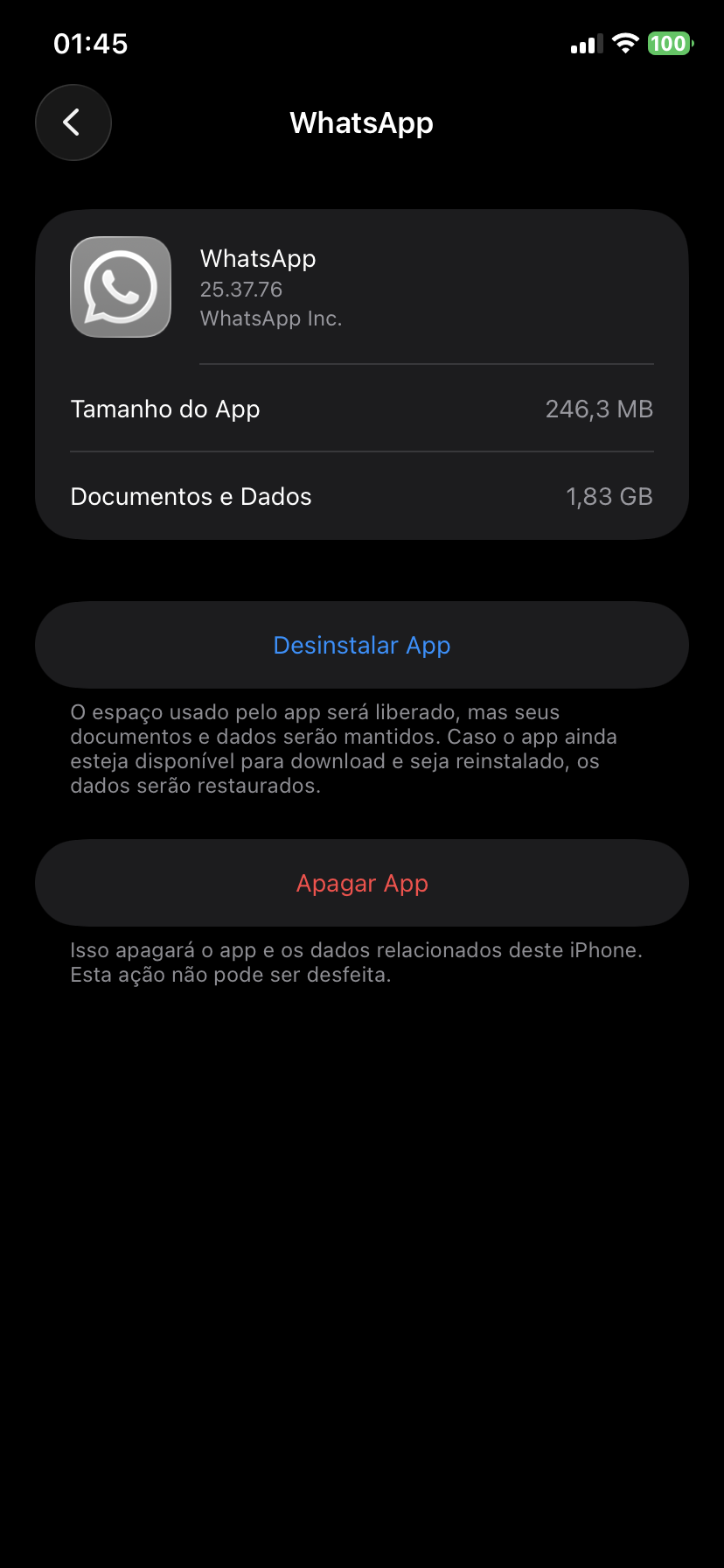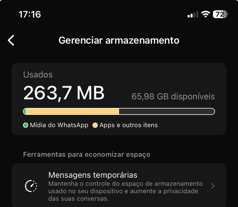 Não consigo efetuar o backup do WhatsApp. Eu apaguei várias conversas e arquivos afim de deixar o backup menor, mas quando tento iniciar o backup agora ele exibe a mensagem que não há armazenamento. Porém, eu tenho sobrando tanto no armazenamento interno quanto no iCloud. Como eu resolvo? Já reiniciei o dispositivo, atualizei o software e o WhatsApp está na versão mais recente também