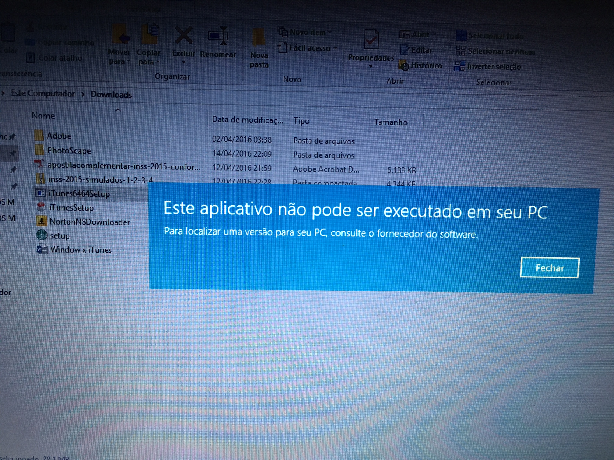 Não estou conseguindo estalar o itunes no meu notbook, uso o windows 10 e o erro que da (Este aplicativo não pode ser executado em seu pc. Para localizar uma versão para o seu pc, consulte o fornecedor de Software. Me ajudem por favor.