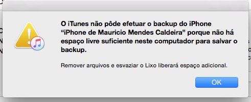 Itunes diz que não há espaço livre no Mac para efetuar backup do iPhone, mas há